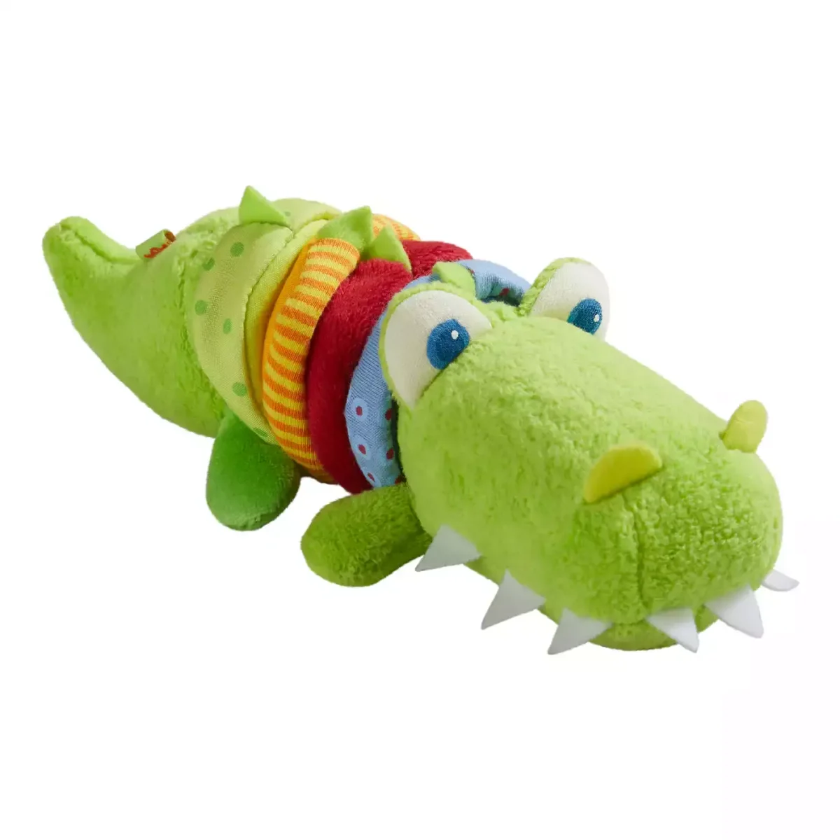 Dieses freundliche Krokodil ist ein lustiges Babyspielzeug und niedliches Kuscheltier in einem. Die Ratterfigur Kroko von Haba sorgt mit bunten Farben und lustigem Ratter-Effekt für jede Menge Spaß und gute Laune. Ziehen deine Kinder den gutmütigen Kroko an Schwanz und Kopf auseinander, rattert er munter in seine Position zurück. Dabei fördert er ganz spielerisch die Feinmotorik und regt mit unterschiedlichen Stoffen und Farben die Sinne an. Und haben die Kinder keine Lust mehr auf Geratter, wird das Haba Krokodil zum liebevollen Kuschelfreund.