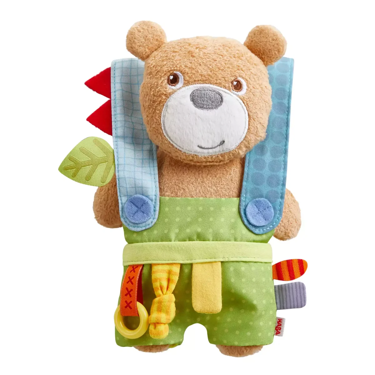 Dieser Teddy hat die Hosentaschen voller Spiel-Spaß! Der farbenfrohe Spieltrainer Bärenspaß von HABA begleitet Babys ab 6 Monaten auf ihren ersten Entdeckungsreisen. Teddys Latzhose fasziniert mit vielen verschiedene Einzelheiten. Dein Kind wird es lieben nach den bunten Stoffen zu greifen und die dicken Knoten zu erkunden. Der gelbe Ring kann zudem in den Mund genommen werden, was das Zahnen unterstützt.