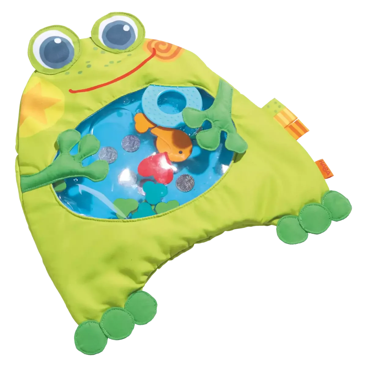 In dem lustig gestaltetem Frosch schwimmen viele verschiedene Motive. Diese können ganz einfach mit den Händen bewegt werden. Durch das Spielen in der Bauchlage auf der Matte werden die motorischen Fähigkeiten des Kindes gefördert. Zudem kann das Kind, durch das Wasser und dem weichen Stoff angenehm auf der Matte liegen. An der Matte ist ein Knisterblatt und ein Beißring befestigt.