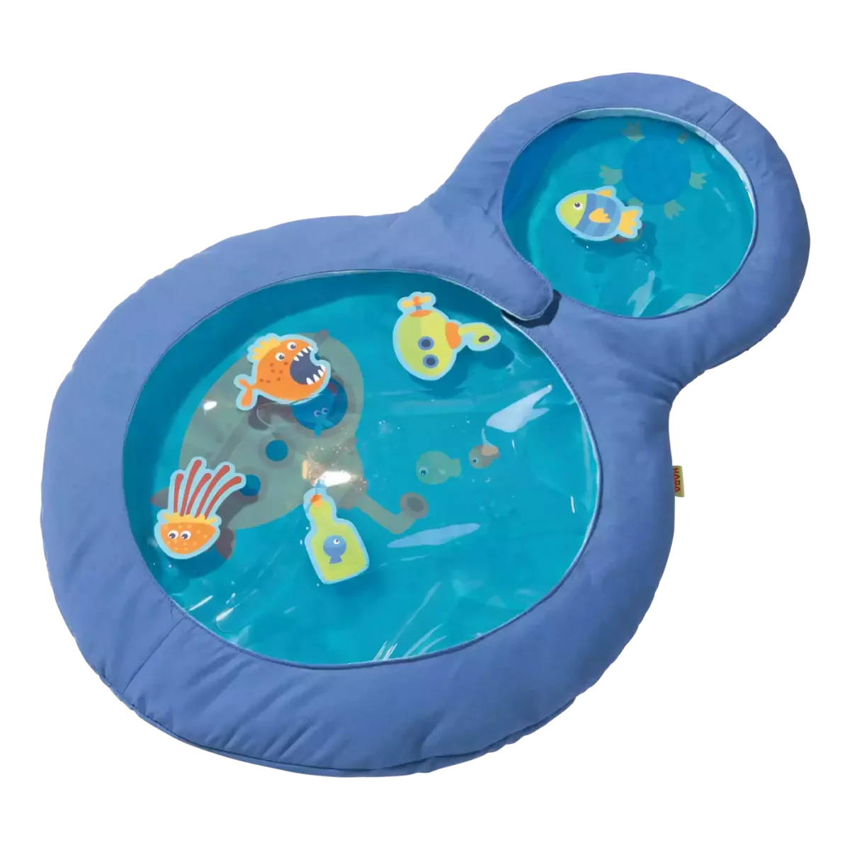 In dem Wasser der Spielmatte schwimmen Taucher und Fische. Diese können ganz einfach mit den Händen bewegt werden. Durch das Spielen in der Bauchlage auf der Matte werden die motorischen Fähigkeiten des Kindes gefördert. Zudem kann das Kind, durch das Wasser und dem weichen Stoff angenehm auf der Matte liegen.