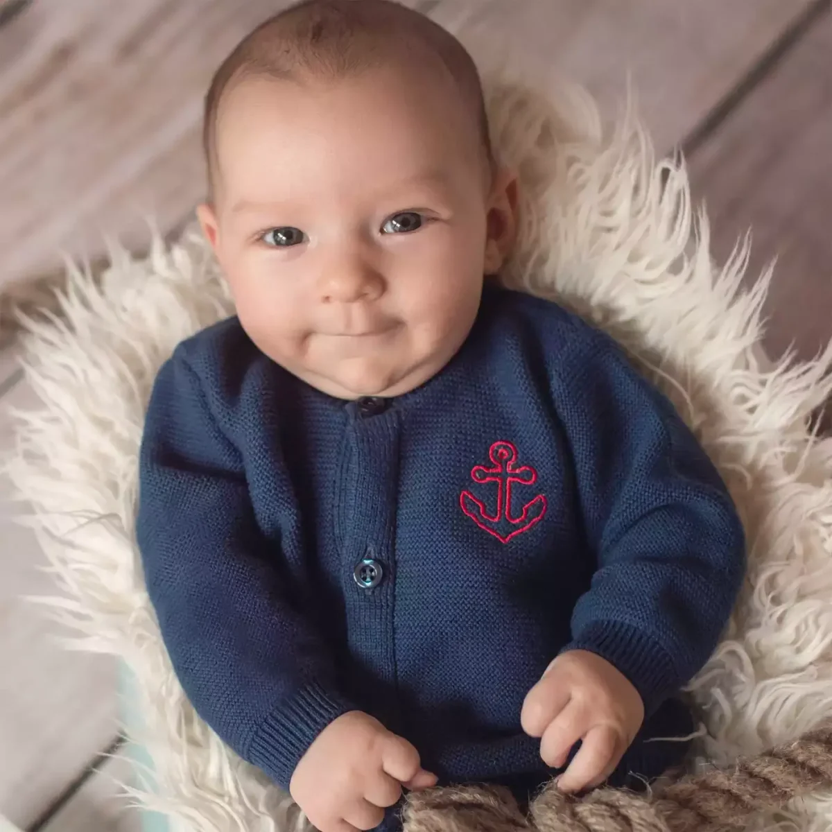 Strickjacke für kleine Matrosen! Diese tolle Jacke aus 100% Baumwolle wird zum Lieblingsstück in jedem Kleiderschrank. Einfach an kühlen Tagen über ein Hemd oder Shirt überziehen und schon kann es losgehen. Ihr klassisches Strickdesign in Kombination mit der hochwertigen Anker Stickerei, macht sie zu jedem Anlass tragbar.