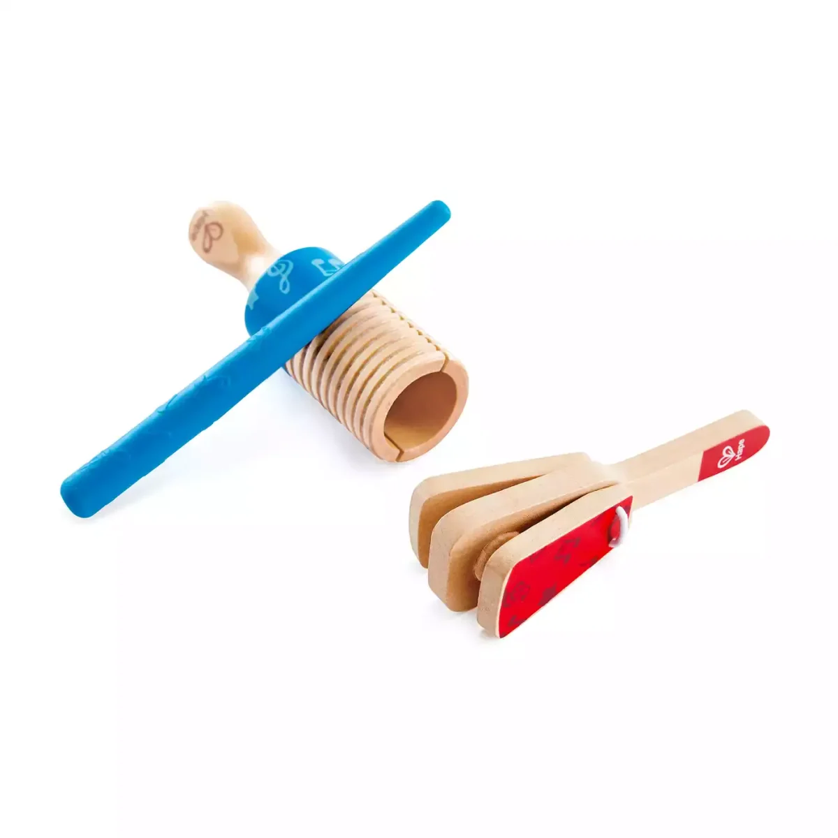 Das spaßige Rhythmus-Set von Hape besteht aus zwei Instrumenten. Der Güiro und die Kastagnette können zusammen oder auch einzeln gespielt werden. Dieses Set besteht aus insgesamt drei Teilen und robustem Holz. Mit dem Set wird das Rhythmusgefühl kleiner Nachwuchsmusiker gefördert. Das Hape Rhythmus-Set eignet sich für Kinder ab ca. 12 Monaten.