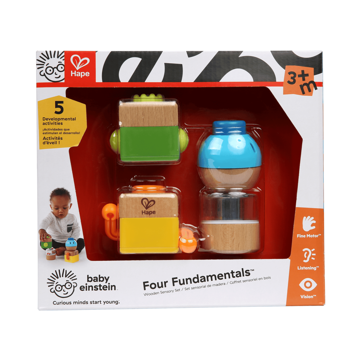 Jeder Baustein überrascht mit spannenden Details, wie einer Rassel oder einem Quietscher, die dazu einladen, Farben, Geräusche, Materialien und Bewegungen spielerisch zu erforschen.
