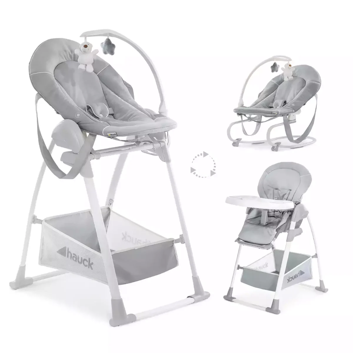 Ein absolutes Allround-Talent ist der Hauck Sit N Relax 3in1 Stretch Grey: Der Hochstuhl ist Wippe, Neugeborenen-Liegestuhl und Kinderhochstuhl in Einem. Er kann bereits ab Geburt durch den Neugeborenenaufsatz verwendet werden. In erhöhter Sitzposition genießen die Allerkleinsten höchsten Komfort und können von Anfang an mit am Familientisch sitzen. Besonders süß ist der Spielbogen mit dem Bärchen- und Sternchen-Anhänger und gleichzeitig werden die motorischen Fähigkeiten gefördert. Praktischerweise kann der Kombihochstuhl Sit N Relax 3in1 auch als Wippe genutzt werden.