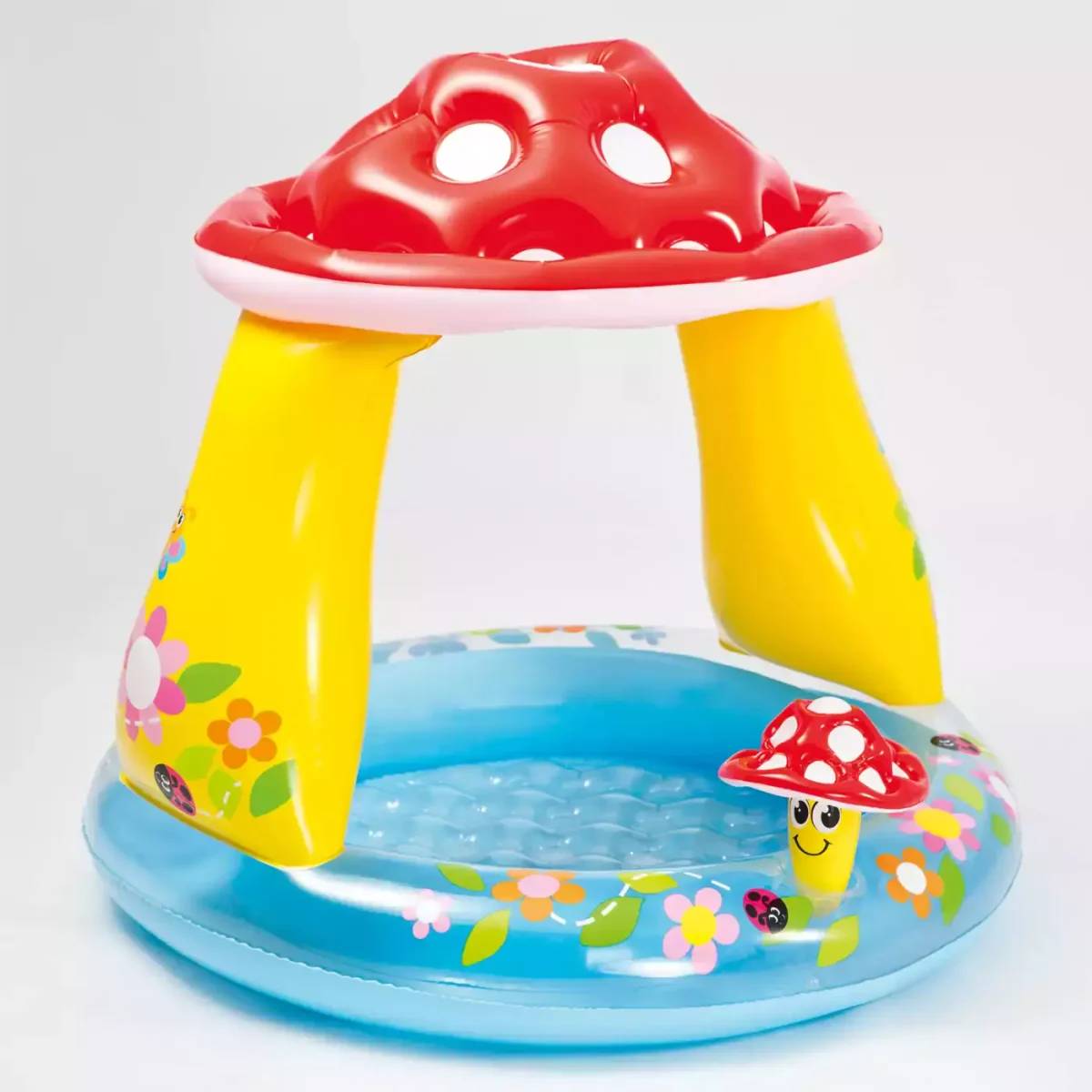 Der niedliche Baby Pool Pilz von Intex wird deinem kleinen Schatz einen riesigen Wasserspaß bereiten. Dank dem integrierten Sonnenschutz in Pilzform wird dein Kind bestens vor der Sonne geschützt. Der Wasserbedarf liegt bei ca. 45 Liter und den Boden kannst du ganz einfach aufblasen. Empfohlen wird der Baby Pool ab einem Alter von ca. einem Jahr. Das wunderschöne Planschbecken bietet an warmen Tagen die perfekte Abkühlung und viel Platz zum Planschen und Spielen.