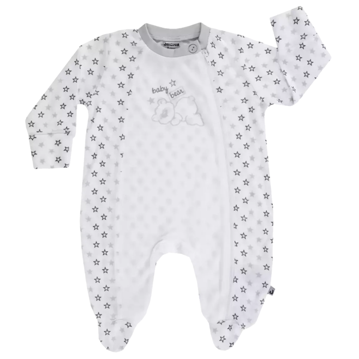 Dieser einteilige Schlafanzug aus TENCEL mit Fuß von Jacky ist mit langen Armen und einem durchgehenden Reißverschluß, für leichtes und schnelles An- und Ausziehen, ausgestattet. Er ist mit kleinen Sternen und einem niedlichen Bärchen bedruckt. Mit diesem Schlafanzug ist dein Baby für kuschelige Nächte bestens ausgestattet.