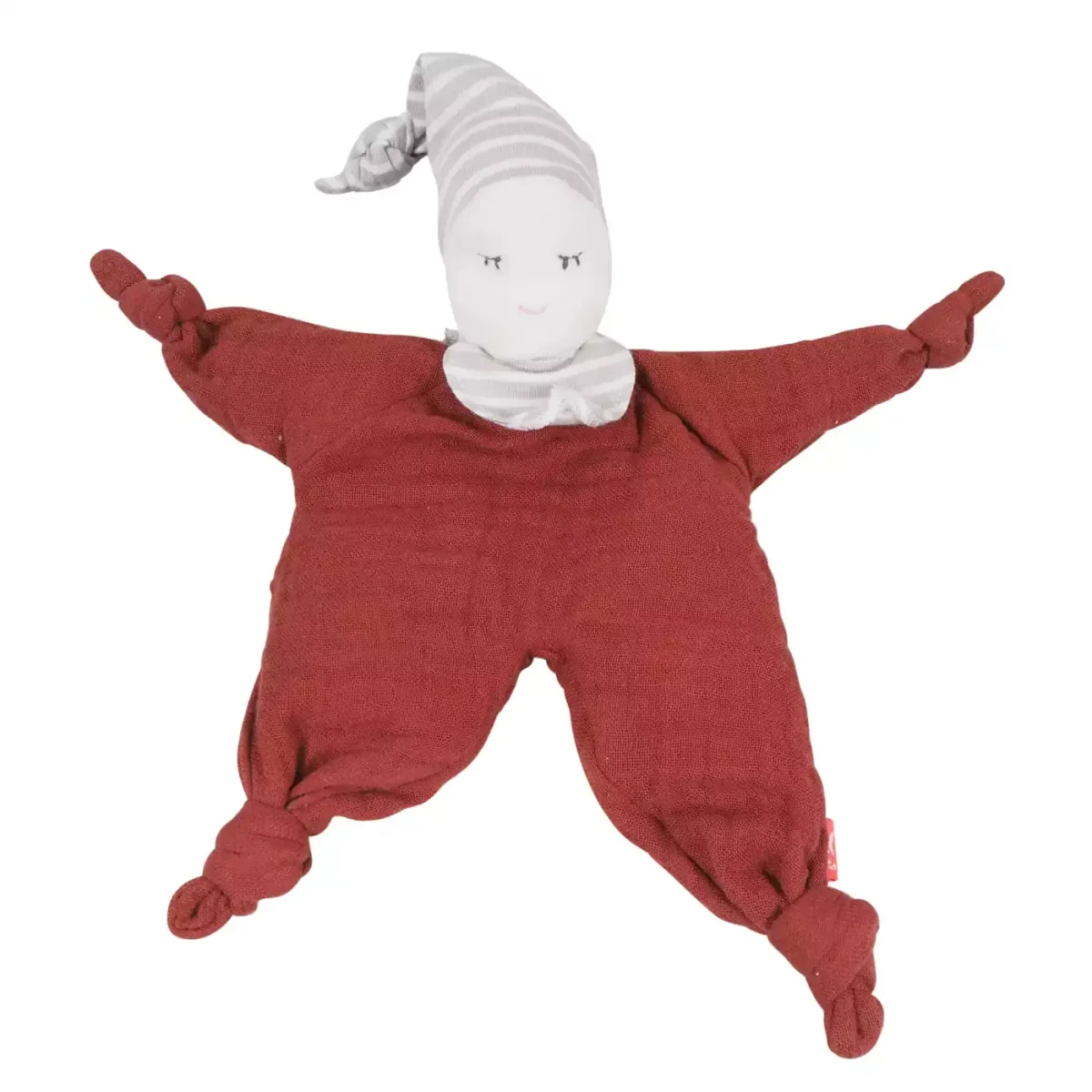 Beim Einschlafen spendet das niedliche, weiche Schmusepüppchen Geborgenheit und ist eine echte Hilfe – tagsüber lädt der Körper aus feinem Musselin, der Kopf sowie die geknoteten Enden zum Greifen, Fühlen und Liebhaben ein.