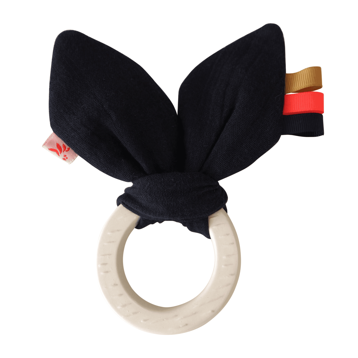 Der strukturierte Kikadu  Beißring aus Naturkautschuk mit Schnuffelöhrchen dient nicht nur der Schmerzlinderung beim Zahnen. Dein Kind kann die weichen Stofföhrchen aus Bio-Baumwoll-Muslin auch mit Händen und Mund erfühlen und sich von der Knisterfolie im Inneren überraschen lassen.