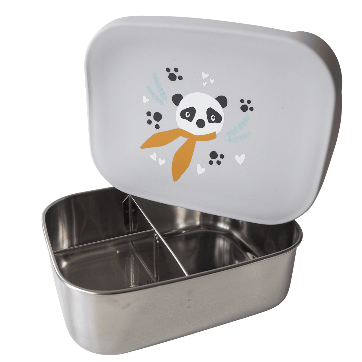 Mit der Brotdose von kikadu lassen sich die Lieblingssnacks von deinem kleinen Schatz überall mit hinnehmen! Sie besteht aus stabilem und rostfreiem Edelstahl, welcher nicht nur leicht ist, sondern auch dafür sorgt, dass weder Geschmäcker noch Gerüche der Lebensmittel aufgenommen werden. Darüber hinaus ist die Box für verschiedene Leckereien in drei praktische Fächer unterteilt. Der Silikondeckel im niedlichen Panda-Design ist frei von BPA und verschließt die Brotbox hermetisch.