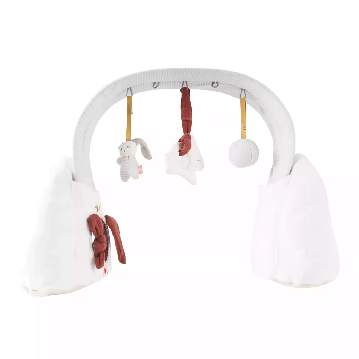 Der Spielbogen Hase von kikadu bietet deinem Kind viele Besonderheiten, so dass es sich darunter besonders wohlfühlen kann. Dank der abnehmbaren Spielfunktionen wie der Rassel, den Spiegeln und dem Naturkautschukhasen wird deinem kleinen Schatz besonders viel zu gucken, beobachten und spielen geboten. Außerdem fördert der Spielbogen das haptische Entdecken und regt die Sinne an.