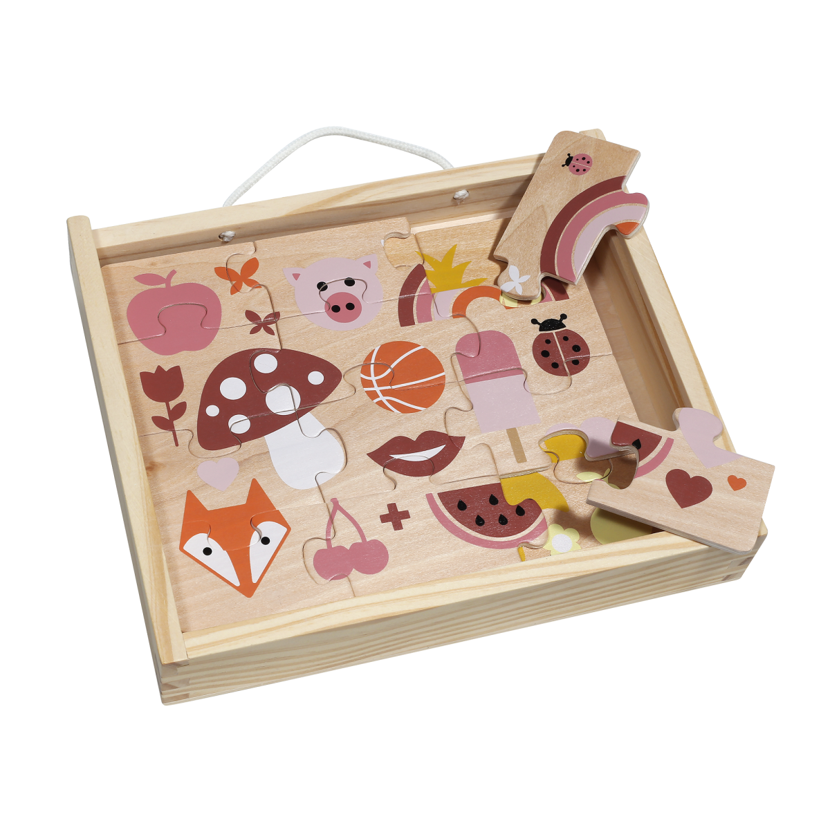 Das Kindsgut Holzpuzzle-Set Farben besteht aus 4 verschiedenen Puzzeln mit schönen Motiven. Aus hochwertigem Holz gefertigt, in schlichten Farben und dezentem Design können Kinder spielerisch die Welt der Farben entdecken. Alle Puzzleteile können in der liebevoll designten Holz Box verstaut werden. Der Deckel der Box bildet einen Rahmen der das Puzzeln erleichtert. Dank der verschiedenen Motive ist langer Spielspaß garantiert und es werden motorische Fähigkeiten und das logische Denken trainiert. Das Holzpuzzle-Set kommt hübsch verpackt und ist ein tolles Geschenk.