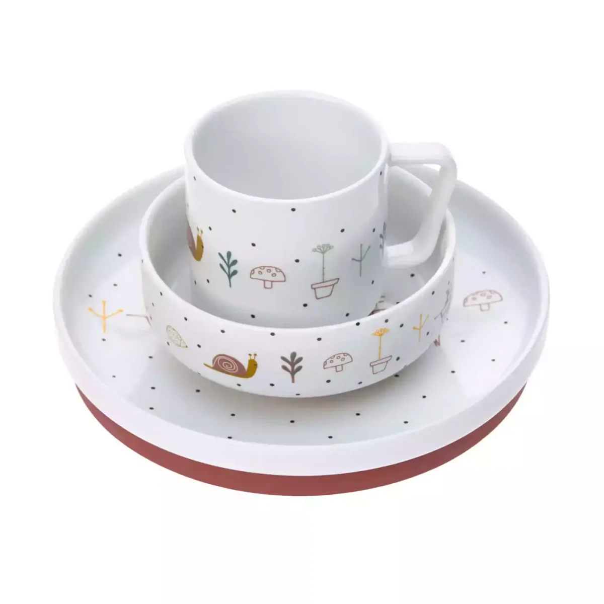 Mit dem LÄSSIG Kindergeschirr Set aus Porzellan essen die Kleinen wie die Großen. Mit den süßen Gartenmotiven – Igel, Schnecke und Weitere – macht das Essen gleich viel mehr Spaß. Für einen besseren Halt auf dem Tisch sind auf der Unterseite des Geschirrs Rutschstopper aus Silikon angebracht. Diese können bei Bedarf einfach abgenommen werden.