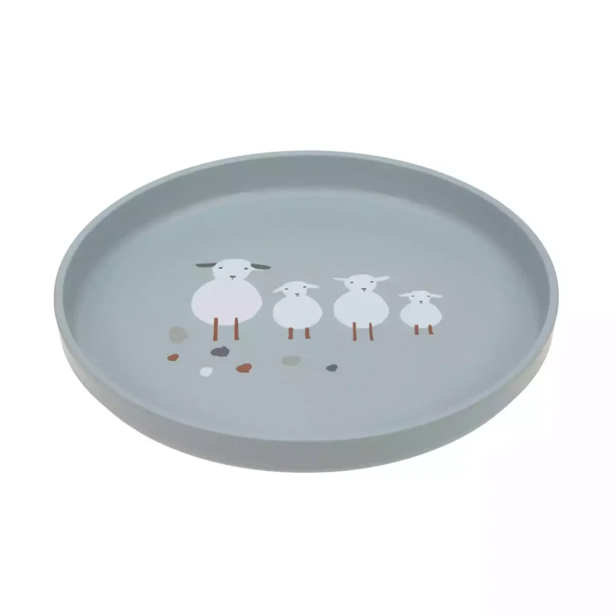 Der rutschfeste Ring auf der Unterseite des Tellers sorgt für einen besseren Halt auf dem Tisch. Der Teller ist nicht nur BPA-frei und sehr leicht, sondern auch spülmaschinen- und mikrowellengeeignet. Das Material besteht aus einer Mischung aus Polypropylen und Zellulose und ist somit nachhaltiger und ressourcenschonender als herkömmliches Polypropylen. Mehrere niedliche Schafe verzieren den Boden des Tellers und bringen automatisch gute Laune an den Esstisch.