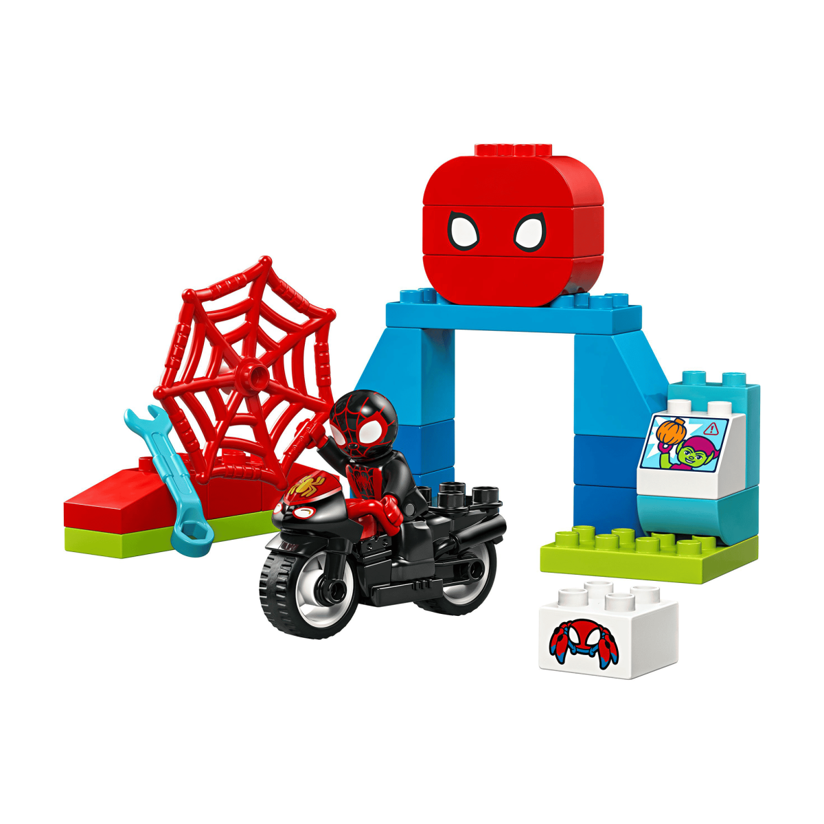 Mit der Figur Spin, einem Spielzeugmotorrad, einer baubaren Rampe, dem Hauptquartier, einem Netz und der Roboterspinne Trace-E kann dein kleiner Schatz spannende Szenen aus der TV-Serie „Spidey und seine Super-Freunde“ nachspielen oder eigene Geschichten erfinden.