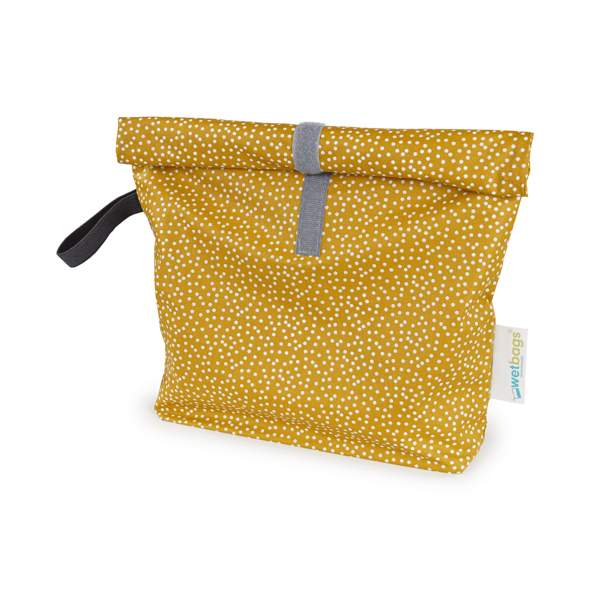 Die Rollup-Wetbag „Mini Dots“ in ocker von Liebes von Priebes ist viel mehr als nur ein einfacher Ersatzkleiderbeutel. Sie bietet ein intelligentes Wechselsystem für die Kleidung deines Kindes. Doch wieso eignet sich diese Tasche dafür so hervorragend? Sie besteht außen aus 100% Baumwolle, die zusätzlich mit einem Acryl beschichtet wird. Das hat den Vorteil, dass die Wetbag wasserabweisend ist. Damit eignet sie sich perfekt für feuchte Wechselwäsche aus dem Kindergarten oder der Krippe, für nasse Badesachen, als Kosmetiktasche oder sogar für müffelnde Turnschuhe.