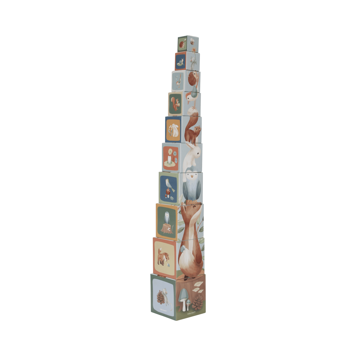 Die Stapelblöcke Forest Friends von Little Dutch laden zu kreativen Bauabenteuern ein! Mit den liebevoll gestalteten Würfeln kann ein hoher Turm gestapelt oder die Blöcke waagerecht auf dem Boden angeordnet werden. Jeder Block zeigt zauberhafte Illustrationen der Forest Friends Kollektion, darunter Eichhörnchen, Füchse, Hasen, Igel, Eulen und Pilze – perfekt zum Entdecken und Spielen.