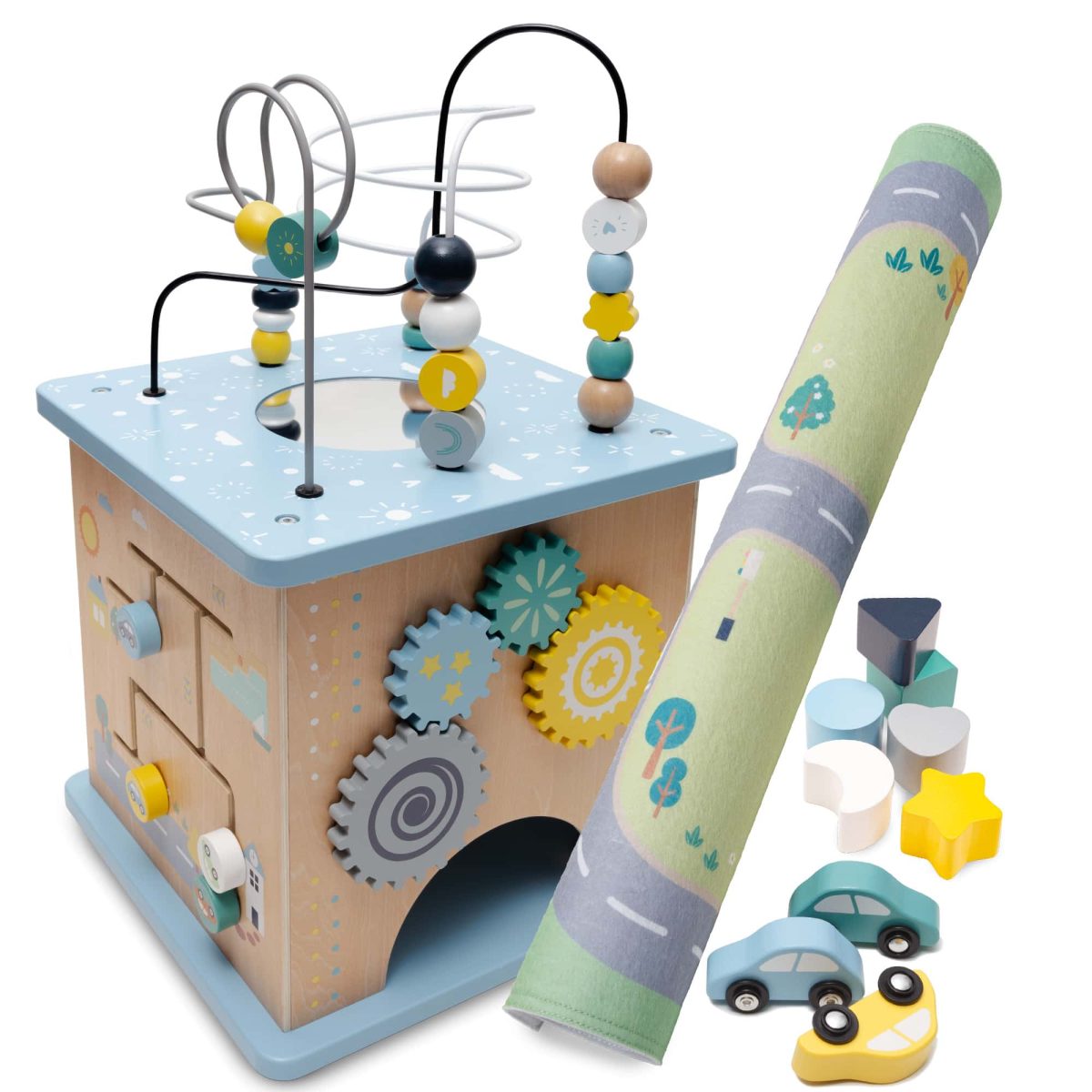 Auf jeder Seite des Würfels warten neue Herausforderungen: Drehelemente mit Zahlen, Schiebe-Knöpfe und Zahnräder fördern spielerisch die Feinmotorik. Die Motorikschleife auf der Oberseite bringt zusätzlichen Spaß und trainiert die Hand- und Augenkoordination. Und das Beste: Der integrierte Verkehrsteppich mit drei kleinen Holzautos macht das Spielerlebnis noch abwechslungsreicher. Denn: Auf dem kunterbunten Teppich werden Fußspuren zu Rennstreifen und kleine Hände zu cleveren Verkehrsplanern. Mit ganz viel Lachen lernt dein Liebling spielerisch, wie er die Straßen (oder besser gesagt, den Wohnzimmerboden) erobert.