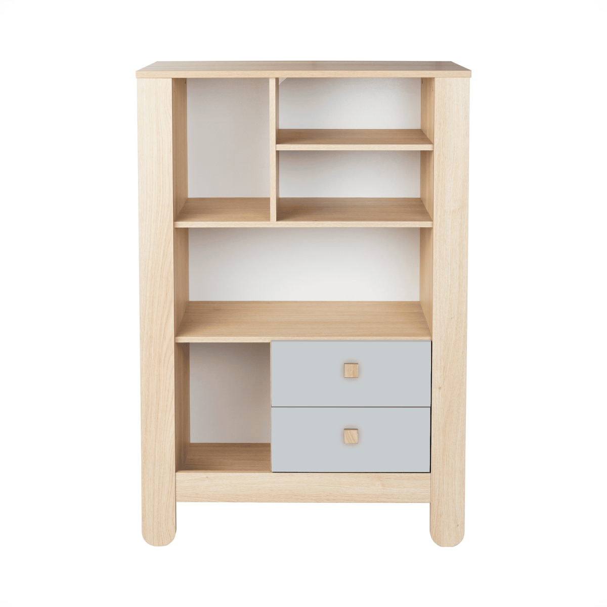 Doch das Möbelstück ist nicht nur praktisch, sondern auch ein echtes Designhighlight, das jedes Kinderzimmer im Handumdrehen verschönert. Die Kombination aus edler Nagano-Eiche und elegantem Lichtgrau verleiht dem Regal eine warme und gemütliche Ausstrahlung, die zum Verweilen und Träumen einlädt.