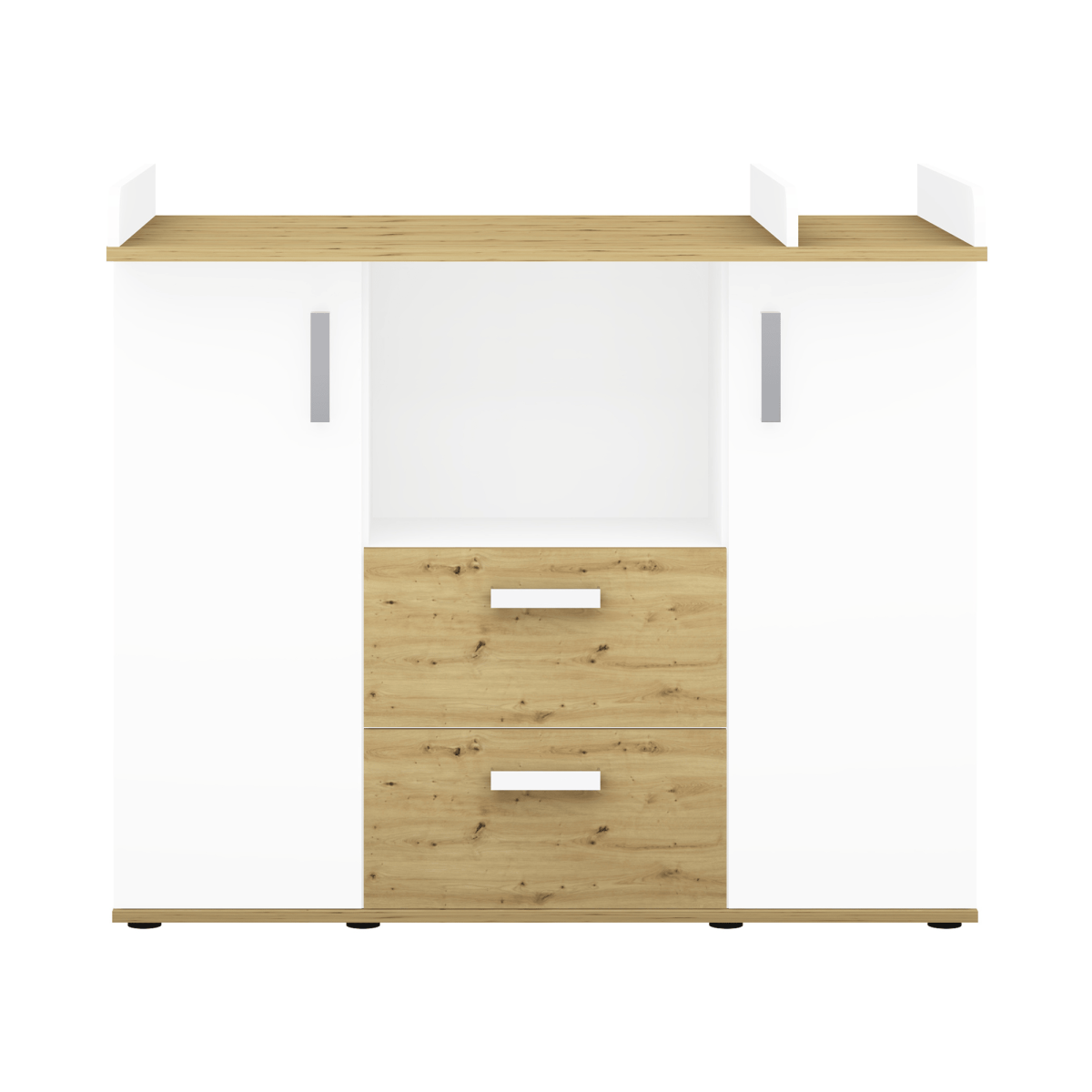 Die Wickelkommode Celina von Mäusbacher ist die perfekte Kombination aus Funktionalität und stilvollem Design. Sie sorgt dafür, dass du alles griffbereit hast, was du für die Pflege deines kleinen Schatzes benötigst. Mit einem offenen Fach, zwei Schubladen und je einem Einlegeboden hinter jeder Tür bietet die Wickelkommode ausreichend Stauraum für Windeln, Kleidung und andere Pflegeutensilien. Der abnehmbare Wickelaufsatz kann durch Sicherungsleisten an der Wickelkommode befestigt werden. So kannst du dir sicher sein, dass der Aufsatz beim Wickeln nicht verrutscht. Die ABS-Kante und die kratzfeste Melaminharzbeschichtung sorgen zusätzlich dafür, dass die Kommode auch nach langem Gebrauch noch aussieht wie neu. Die Farbgestaltung in ice white supermatt und Asteiche bringt einen Hauch von Eleganz in dein Zuhause und schafft eine beruhigende Atmosphäre für dich und dein Baby.