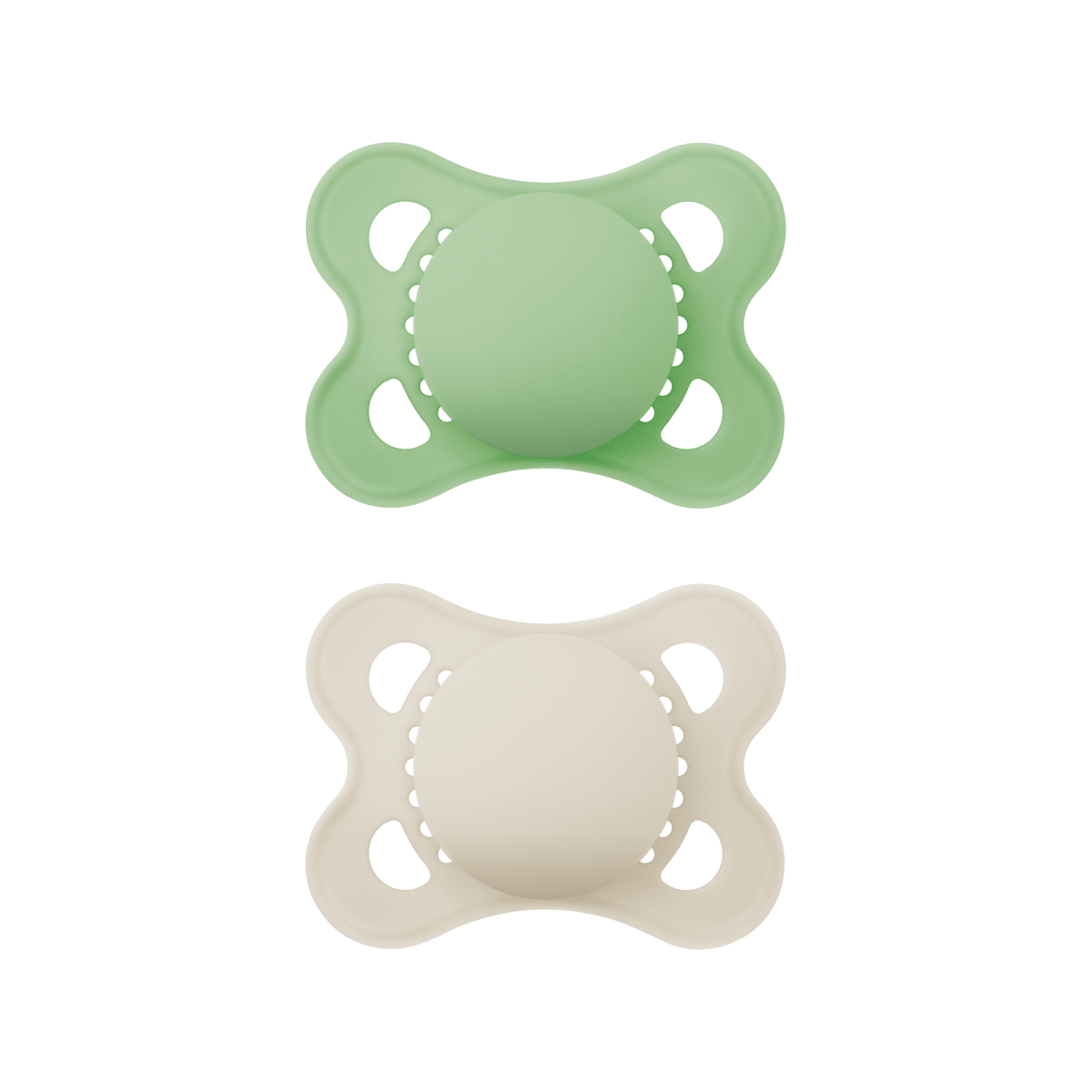 Dieses 2er-Set Beruhigungssauger Original Silikon 0-6 Monate von MAM besteht aus einem grünen Schnuller und einem beigen Schnuller.