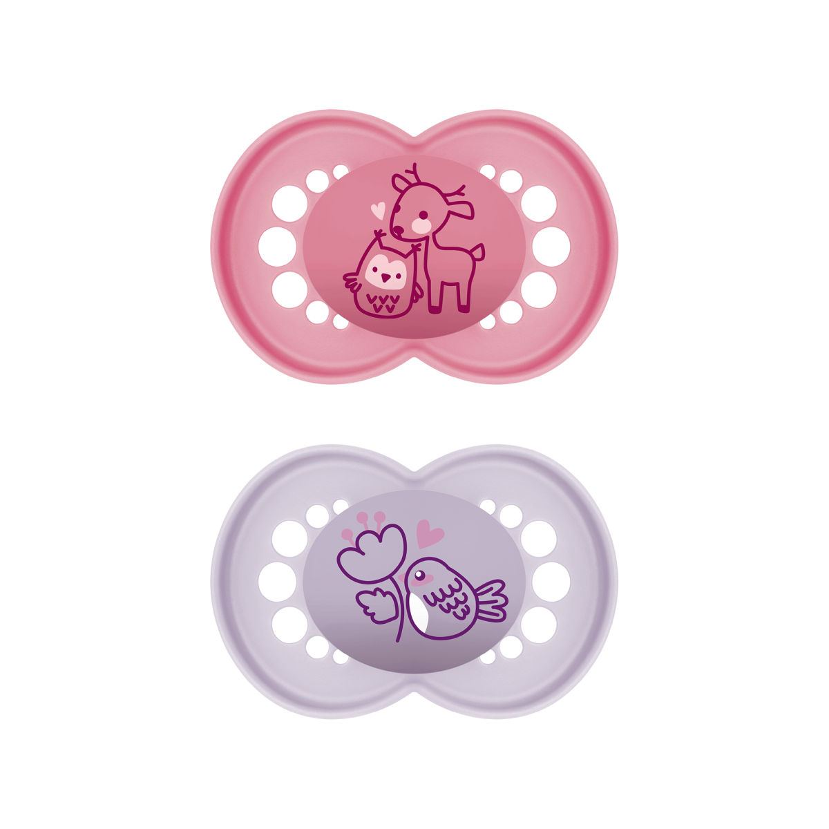 Dieses 2er-Set Beruhigungssauger Original Silikon 6-16 Monate von MAM besteht aus einem rosa Schnuller mit einem niedlichen Eulen-Rentier-Motiv und einem lila Schnuller mit einem Vogel-Motiv.