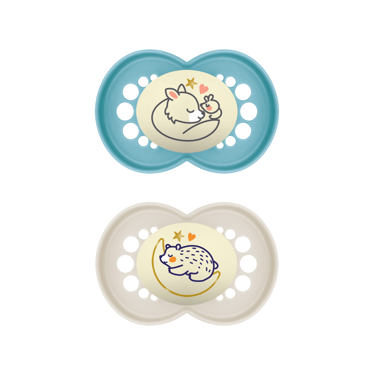 Der Sauger besteht aus speziellem SkinSoft Silikon, das sich besonders weich und vertraut anfühlt und so von 94% der Babys instinktiv akzeptiert wird. MAM Schnuller werden gemeinsam mit Zahnmediziner*innen und Kieferorthopäd*innen entwickelt und sind dank ihres symmetrischen, flachen Saugteils besonders zahn- und kieferfreundlich. Zusammen mit dem symmetrisch geformten Schnullerschild liegt der Schnuller immer richtig herum in Babys Mund. Das Schild ist besonders sanft zu Babys empfindlicher Haut dank großzügiger Luftlöcher, der abgerundeten Form und der Noppen auf der Innenseite. Der Schnullerknopf ist für die kleinen Babyhände einfach zu greifen, aber gleichzeitig so flach, dass der Schnuller für deinen Liebling in jeder Lage bequem ist. Der praktische MAM Original Pure Night Schnuller leuchtet im Dunkeln. So kann er von dir und deinem Kind einfach wiedergefunden werden und beschert ruhigere Nächte.