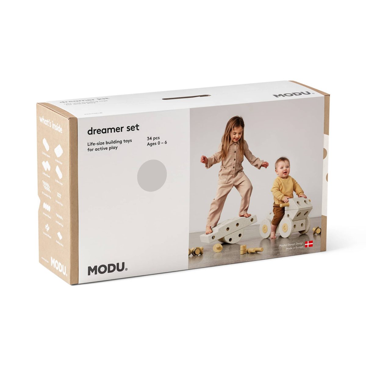 Das MODU Dreamer Set lässt die Träume deines Kindes wahr werden: Mit diesem faszinierenden Bauset, bestehend aus 34 Teilen, können mehr als 25 einzigartige, lebensgroße Spielzeuge und Kreationen erschaffen werden. Die Teile ermöglichen fantasievolles Spielen und fördern die Kreativität deines kleinen Abenteurers.