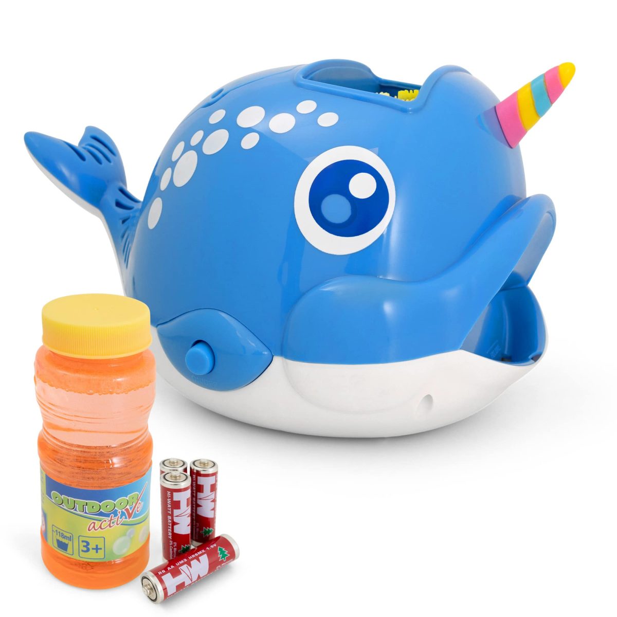 Aus der wunderschönen Seifenblasenmaschine in der niedlichen Form eines Wales von Outdoor active sprudeln in kürzester Zeit bis zu ca. 20.000 Seifenblasen heraus. Die Seifenblasen können bis zu ca. 6 Meter hochfliegen. Der verzaubernde Anblick von so vielen wunderschönen Seifenblasen wird deinem kleinen Schatz besonders gefallen.