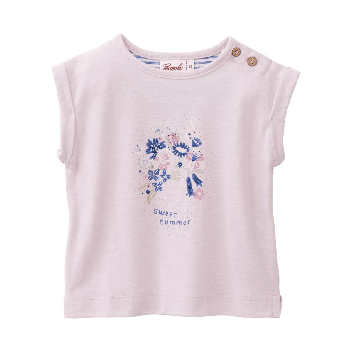 Das T-Shirt Blumen von People Wear Organic versprüht mit seinem liebevoll gestalteten Print „sweet summer“ echte Sommerlaune. Der zarte Farbton, das florale Motiv in Eisform und die weiche Bio-Baumwolle machen das Shirt zu einem Lieblingsstück für sonnige Tage. GOTS-zertifiziert und mit praktischen Knöpfen an der Schulter ausgestattet, überzeugt es durch hohen Tragekomfort und nachhaltige Qualität.
