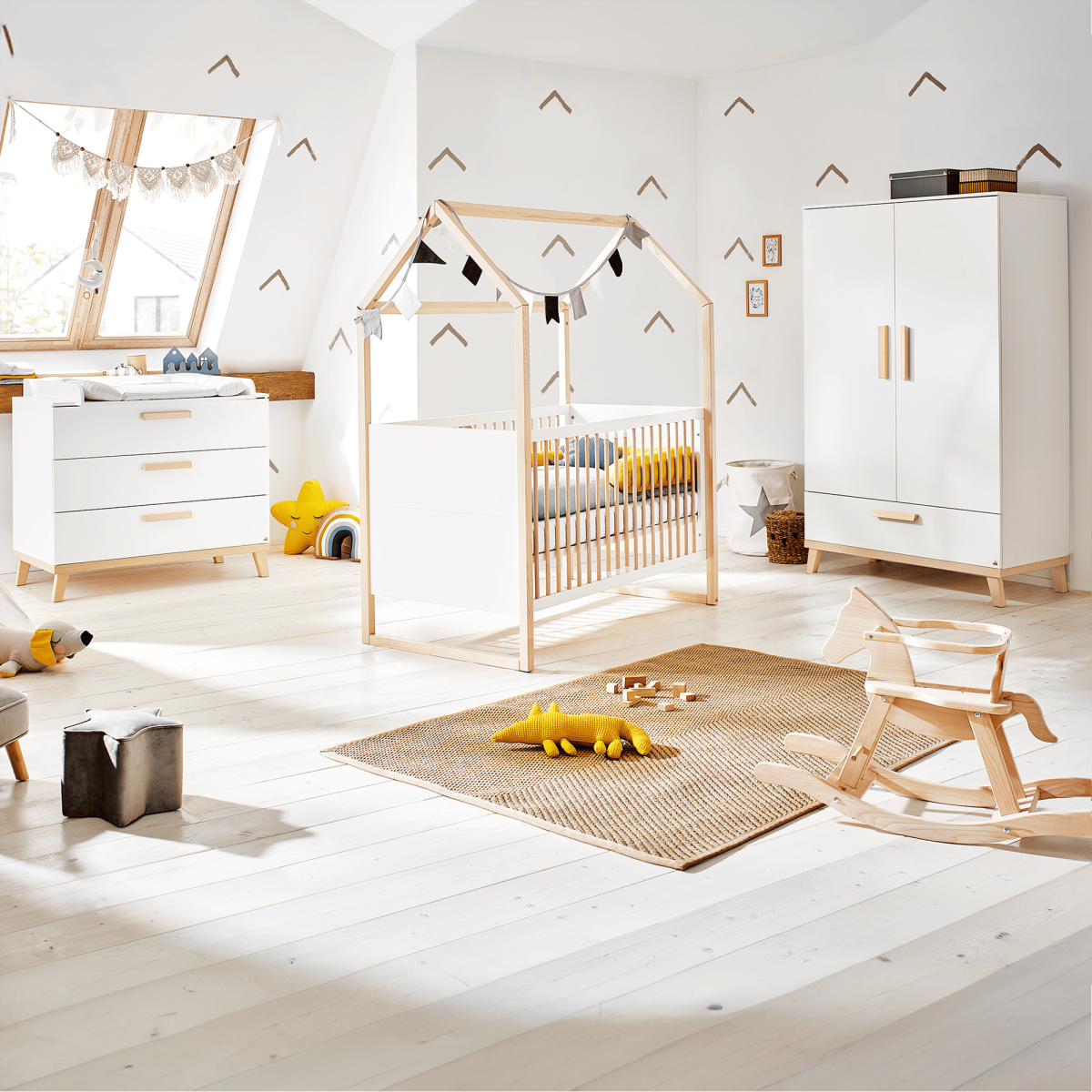 Das bezaubernde 3-teilige Spar-Set Babyzimmer Larsson von Pinolino besteht aus einem Hausbett inkl. 3-fach höhenverstellbarem Lattenrost, einer schönen Wickelkommode inkl. Wickelaufsatz sowie einem 2-türigen Kleiderschrank. Weitere Möbel aus dem Kinderzimmer Larsson sind separat erhältlich.