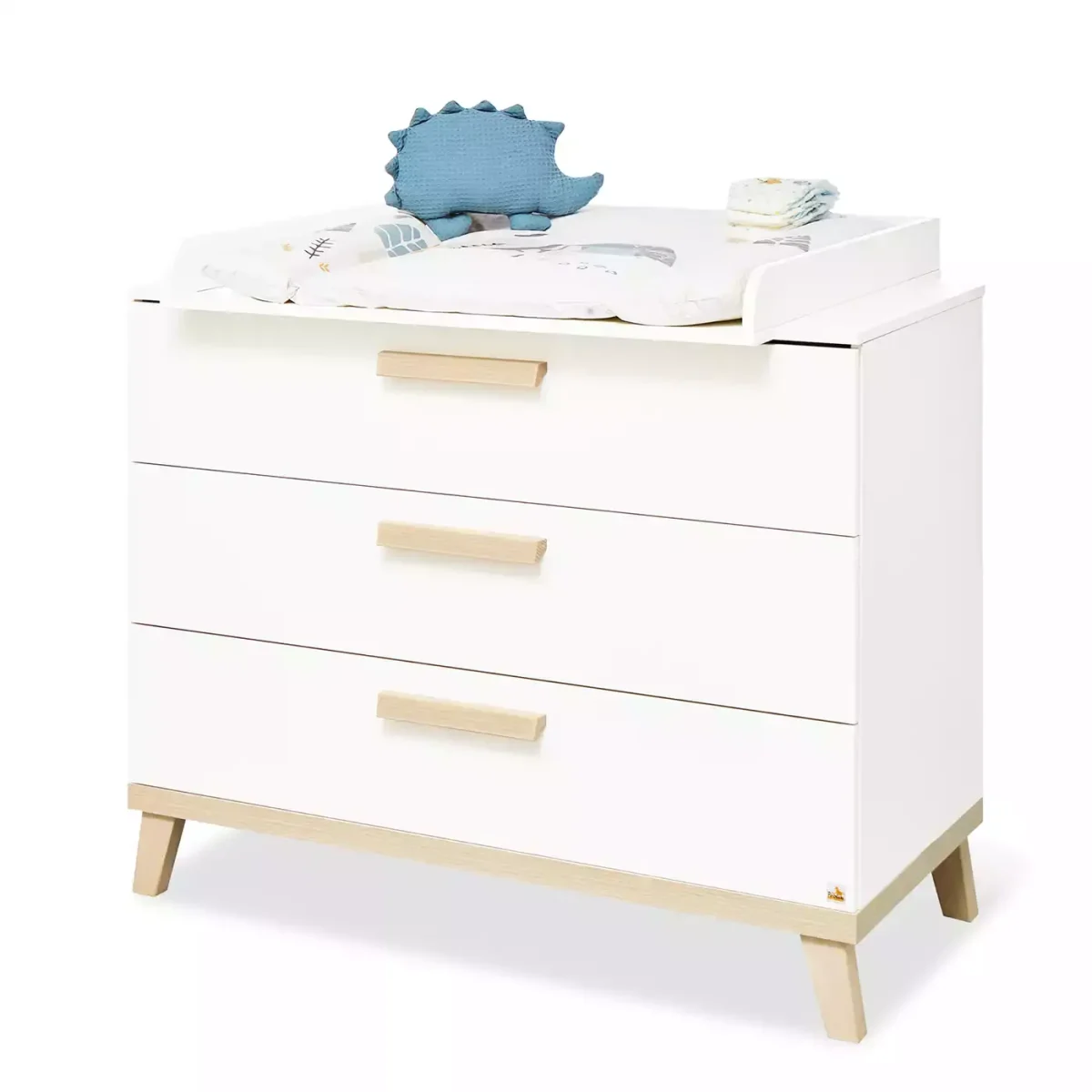 In der bezaubernden Wickelkommode Larsson von Pinolino findest du drei große Schubladen um eine ideale Ordnung im Kinderzimmer zu kreieren. Ein abnehmbarer Wickelaufsatz, den du rechts, mittig und links auf der Kommode montieren kannst, ist inklusive.