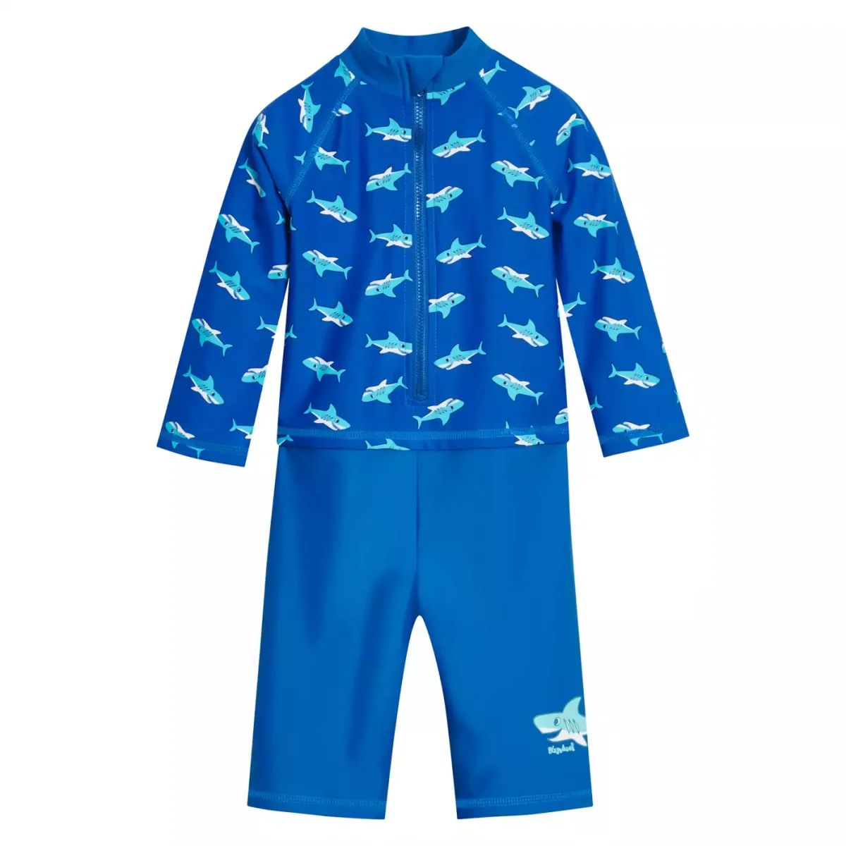 Mit dem bequemen und langärmligen UV-Schutz Einteiler Hai von Playshoes steht dem sorgenlosn Badespaß mit deinem kleinen Schatz nichts mehr im Wege. Der integrierte UV-Schutz 50+ schützt dein Kind zuverlässig vor der Sonne. Dank dem langen und unterlegten Reißverschluss mit Kinnschutz wird das An- und Ausziehen erleichtert.