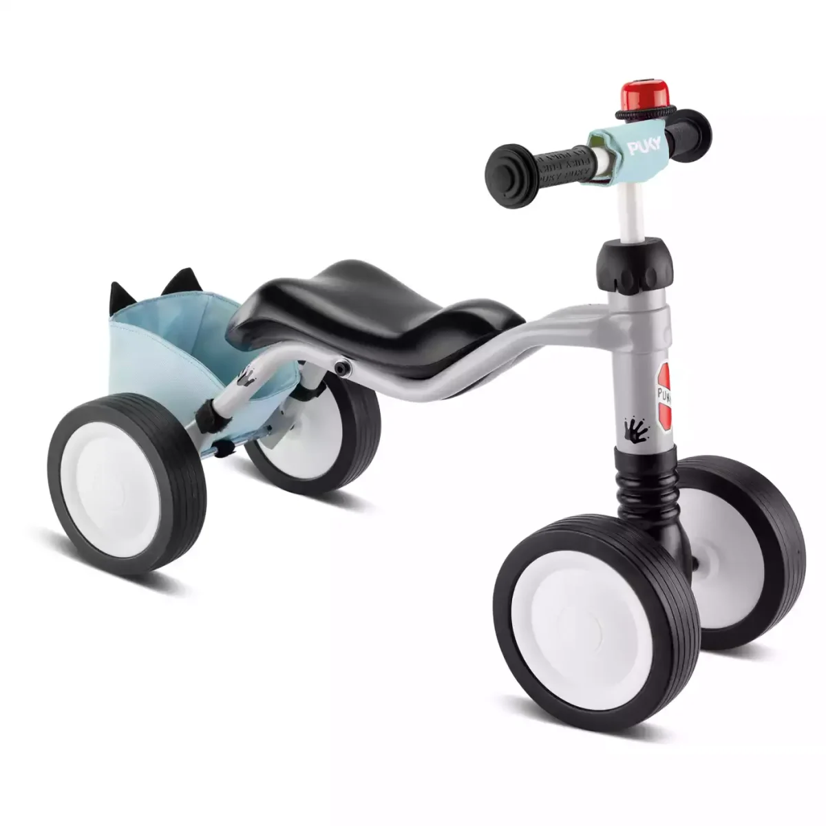 Das PUKY WUTSCH Bundle Grey Racoon bietet mehrere zusätzliche Funktionen als die klassische Version. So sind eine kinderfreundliche, rote Drehglocke, ein blaues Lenkerpolster und eine blaue Rahmentasche im niedlichen Waschbär-Design bereits im Set enthalten.