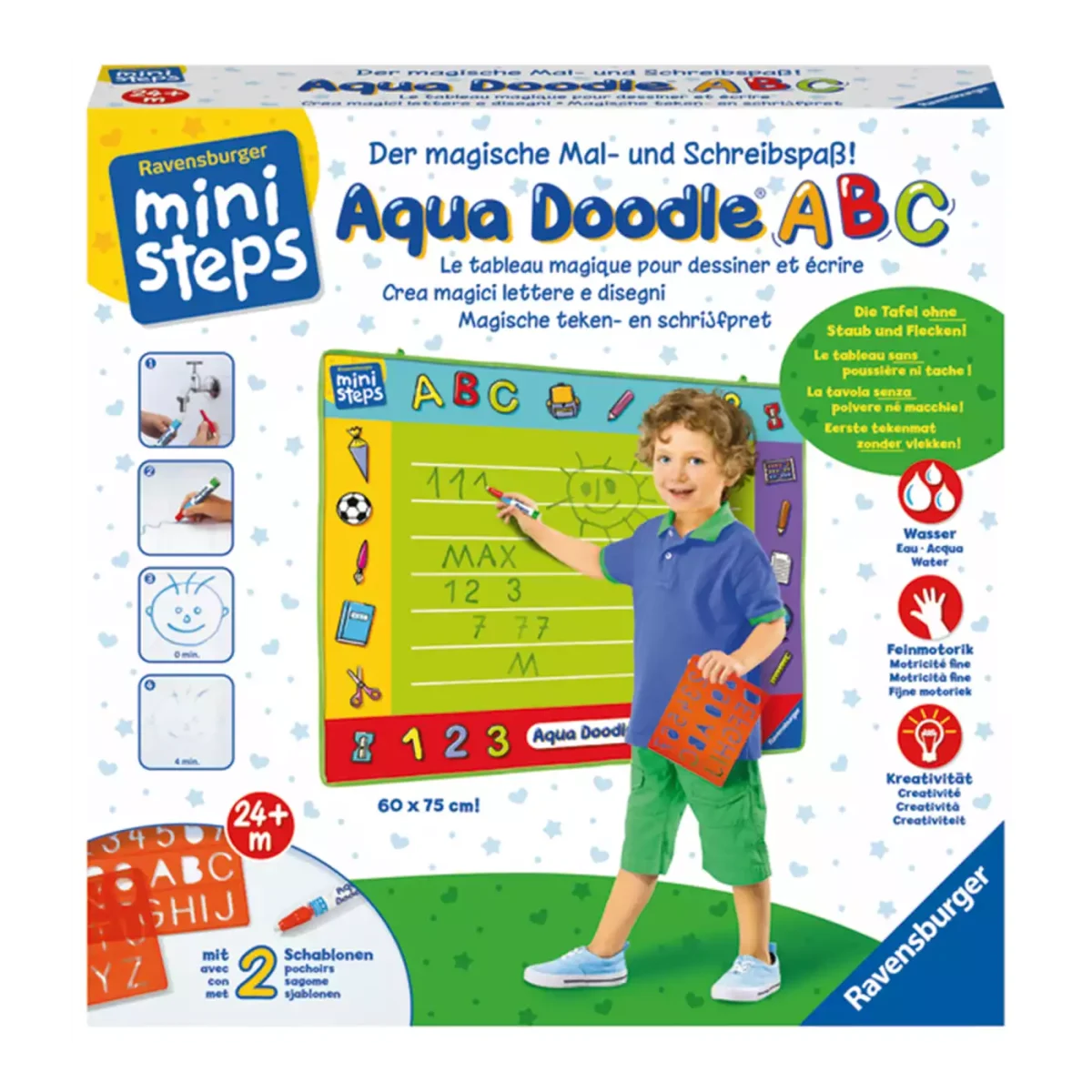 Die farbenfrohe ABC-Lerntafel ist eine große Stofftafel, auf der das Kind mit reinem Leitungswasser magisch Malen und Schreiben kann. Die Striche verschwinden wieder, sobald sie getrocknet sind. Die Lerntafel fördert die Feinmotorik, Konzentration und Kreativität des Kindes. Inklusive zwei Schablonen für junge und ältere Künstler und einem Schreibstift mit feiner Spitze, der auf der Tafel dunkelgrün schreibt.