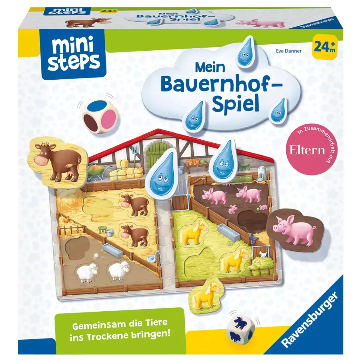 Ein Wolkenbruch naht! Also nichts wie los: Alle Spieler versuchen zusammen, die Tiere in den sicheren Stall zu bringen, bevor die Regenwolke voller Tropfen ist. Dieses spannende gemeinsame Spielziel lässt die Kinder Momente intensiven Wir-Gefühls erleben und fördert gleichzeitig das erste Regelverständnis, die Feinmotorik, die Sprachentwicklung sowie die Unterscheidung von Farben und Formen. Es ist ab einem Alter von ca. 24 Monaten geeignet.