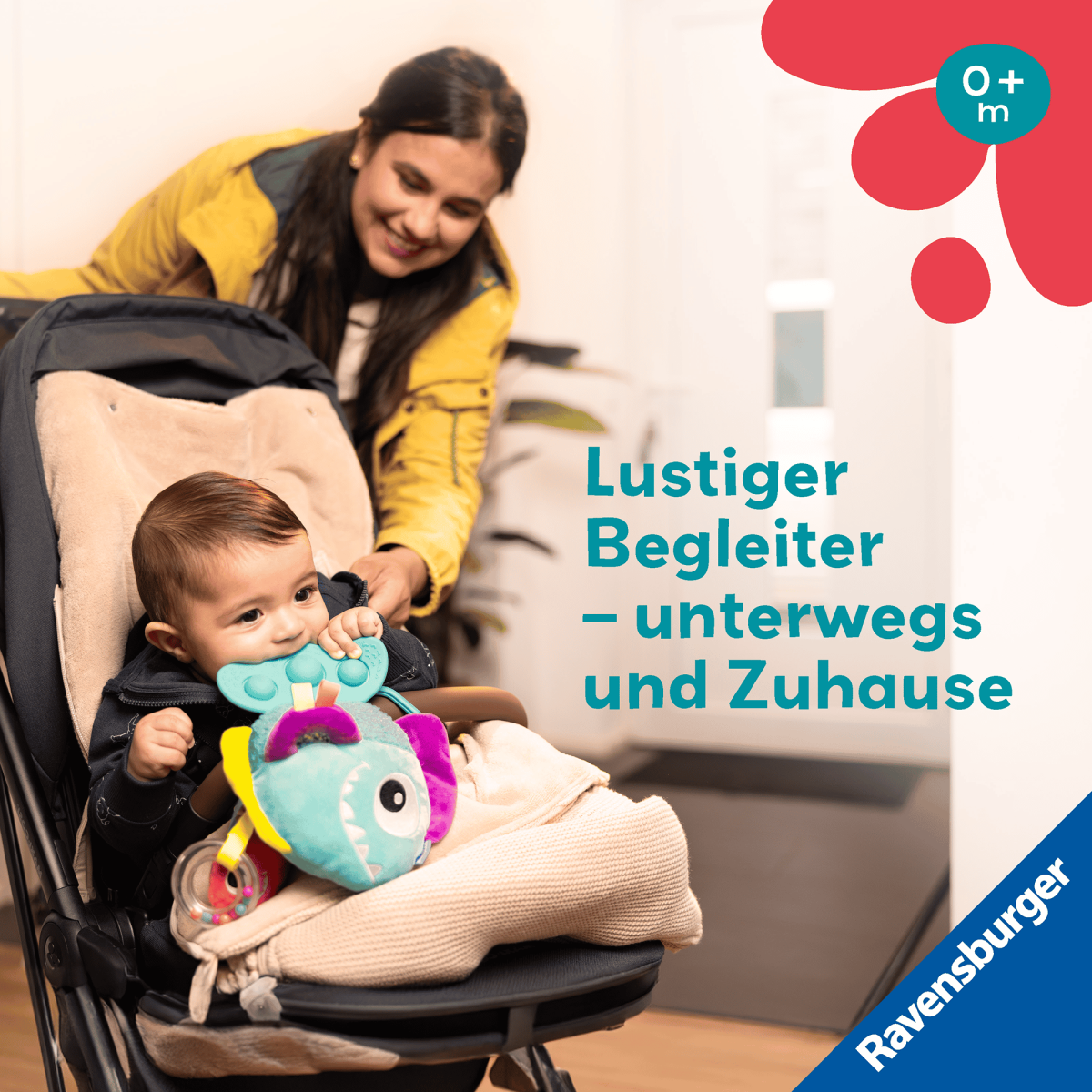 Der Play+ Pop-it Piranha von Ravensburger ist nicht bissig. Im Gegenteil: Sein weicher Körper lädt zum Kuscheln ein. Doch der kleine Fisch hat noch mehr zu bieten als nur eine entspannte Kuschelzeit. Mit seinen bunten Flossen, der integrierten Rassel und dem Fischschwanz aus 100% Silikon bietet der Piranha vielseitige Spiel- und Greifmöglichkeiten. Besonders der strukturierte Fischschwanz ist ideal für zahnende Babys. Das handliche Design fördert die Feinmotorik und kann dank des praktischen Clips leicht an Babyschalen oder Kinderwagen befestigt werden. Ein treuer Begleiter für unterwegs und zu Hause, der Spaß und Entwicklung perfekt vereint!