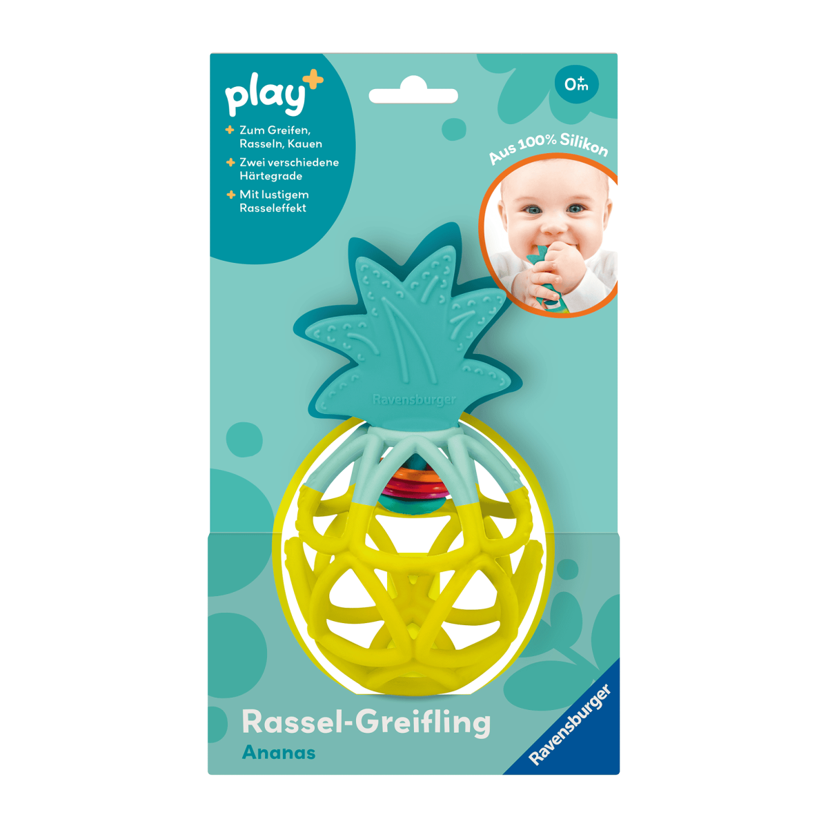 Mhhh – wie wohl die Play+ Rassel-Greifling Ananas von Ravensburger schmeckt? Leider nach nichts, doch deinem Baby wird das nichts ausmachen. Denn bei der Ananas geht es nicht um den Geschmack, sondern vielmehr um den Spiel- und Beißspaß. Die Frucht kann leicht gegriffen werden und eignet sich durch die härteren und strukturierten Blätter ideal zum Herumkauen – perfekt für zahnende Babys. Zusätzlich animiert die Rassel zum Schütteln und fördert so die Feinmotorik.