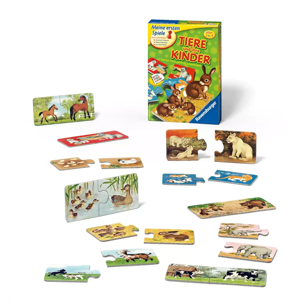 Zu wem gehören die Löwenbabys? Und wo ist die Katzenmama der kleinen Kätzchen? Spielerisch entdecken die Kinder in „Tiere und ihre Kinder“, welche Tiere zusammengehören. Beim Zuordnen der Bildpaare werden die Kinder zum Fragen und Erzählen angeregt. Was fressen die Affen? Und wie heißen die Kinder der Rehe? So erweiterst du ganz nebenbei ihren Wortschatz. Die Kinder greifen und begreifen die Tierkarten und durch die Selbstkontrolle im Puzzle-Prinzip lernen sie sofort, ob die Karten zusammenpassen. Das Erfolgserlebnis bestärkt die Kinder darin weiterzumachen. So spielen sie allein, gemeinsam mit den Eltern oder anderen Kindern und treten in Interaktion. Verschiedene Spielmöglichkeiten sorgen dafür, dass das Spiel lange interessant bleibt.