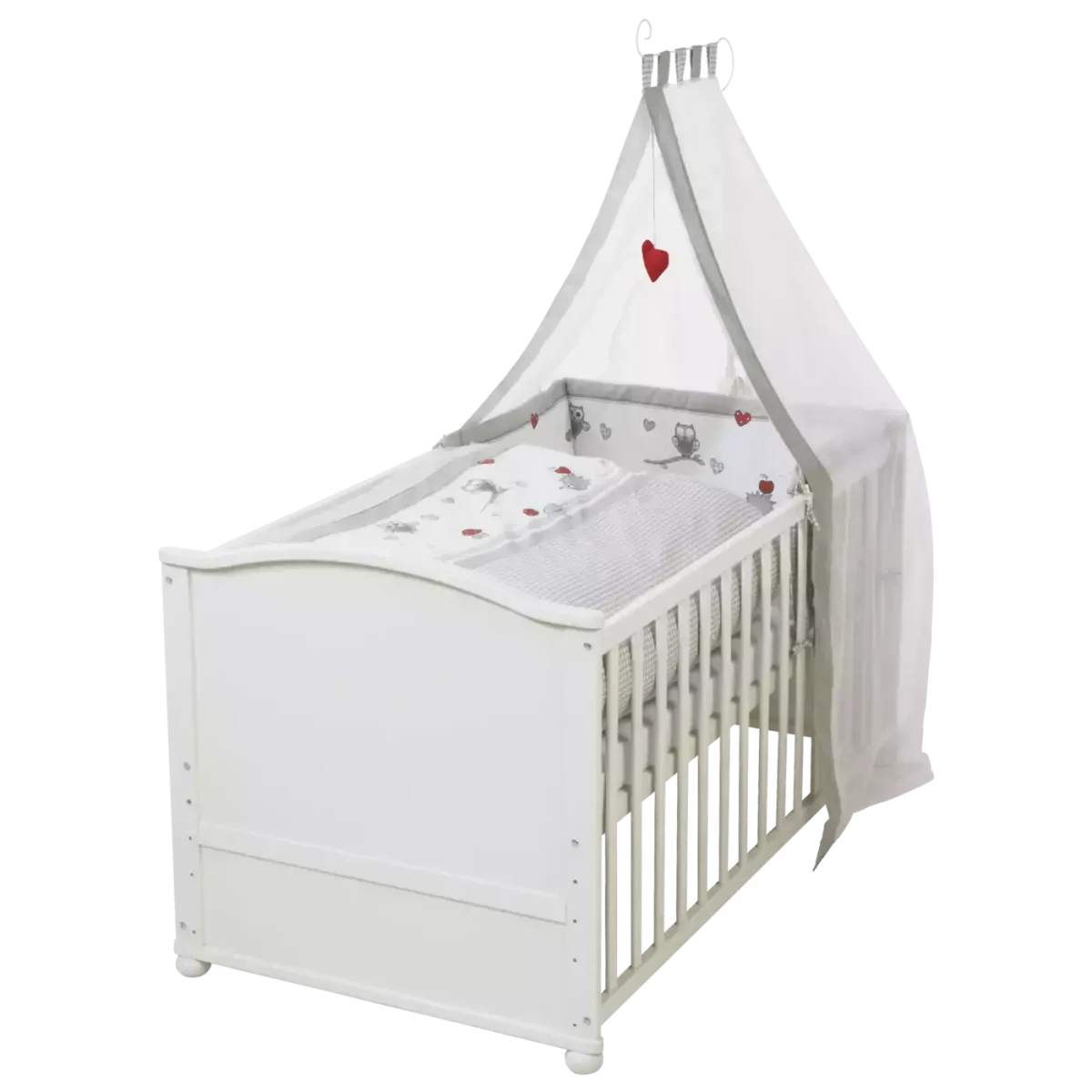 Das Komplettbett Adam + Eule ist 3-fach höhenverstellbar und mit den integrierten Umbauecken am Lattenrost kann es zu einem Juniorbett umgebaut werden. Die 3 Schlupfsprossen können herausgenommen werden. Die Kinderbettausstattung (ohne Inlett) und die antiallergische Polyestervliesmatratze sind inklusive.