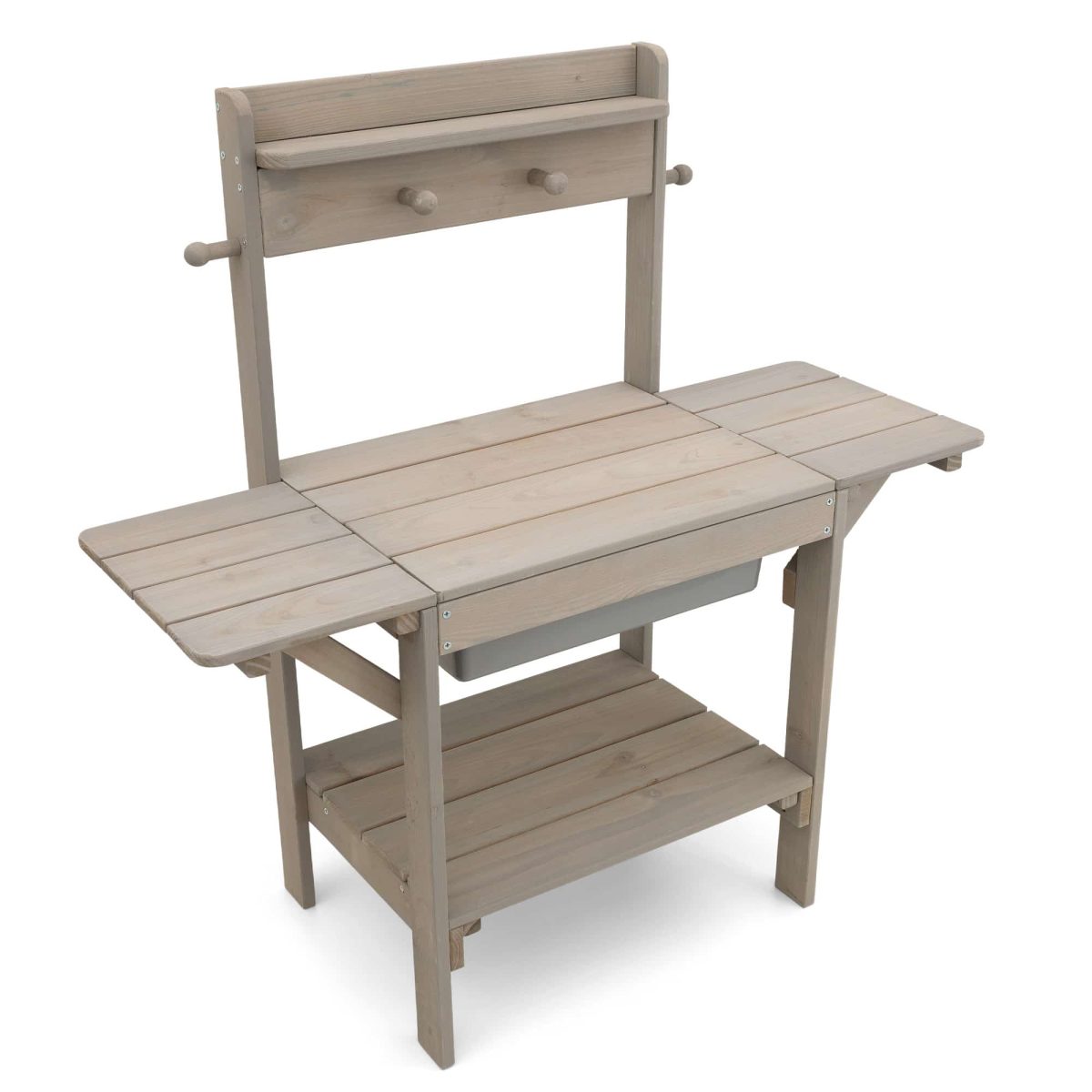Im Winter kannst du die Gartenküche drinnen zum idealen Basteltisch mit Stauwanne für Stifte, Knete und Bastelsachen umfunktionieren. Dank des abnehmbaren Deckels eignet sich auch als Arbeits-, Spiel- oder Maltisch. Die unter der Abdeckung integrierte herausnehmbare Wanne aus robustem Kunststoff lässt sich ideal als Spielgelegenheit nutzen und ist leicht zu reinigen. Für weiteren Stauraum sorgen die Ablagefläche unter der Kunststoff-Wanne und ein Ablagebrett im oberen Bereich des Matschtisches. An den vier praktischen Haken kann dein kleiner Schatz Zubehör aufhängen.