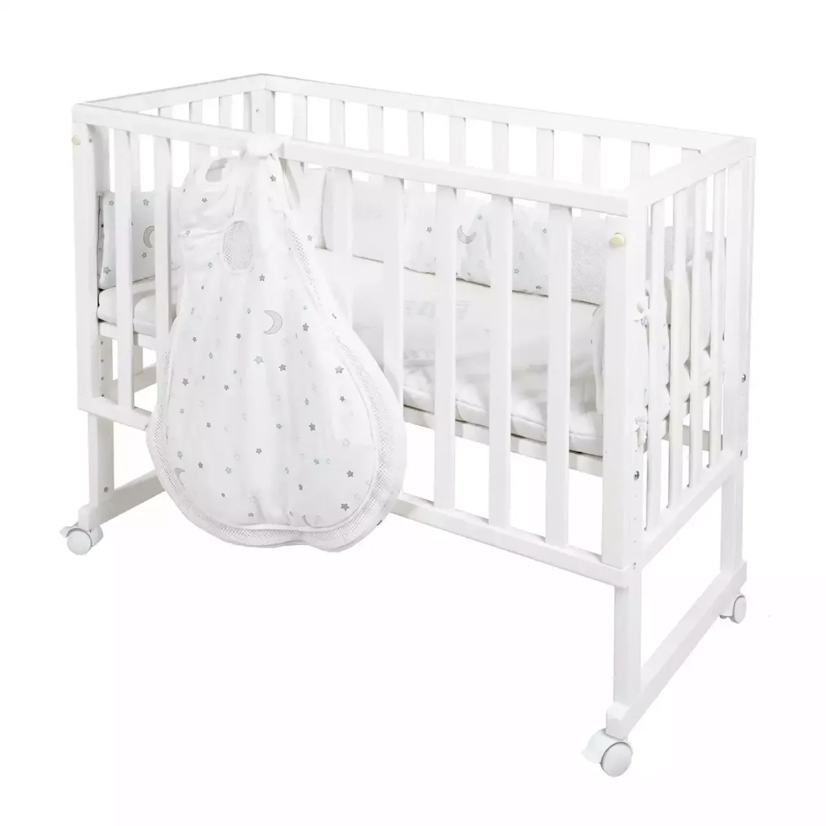 Das Stubenbett „safe asleep® 3in1“ bietet ein ideales Schlafklima und ist Beistellbett zum Elternbett, Babybett und Kinderbank in einem. Das weiß lackierte Bettchen kommt inklusive atmungsaktiver Matratze mit Jaquard Bezug, gepolstertem safe asleep® Nestchen Air und safe asleep® Schlafsack Easy Air Gr. 56/62 im Design „Sternenzauber“. Das Stubenbett lässt sich mit den mitgelieferten Haken leicht und sicher am Elternbett einhängen und durch die Höhenverstellung auf die Höhe der Elternmatratze einstellen. Vier mitgelieferte Bremsrollen machen es zum mobilen Stubenwagen oder Babybett.