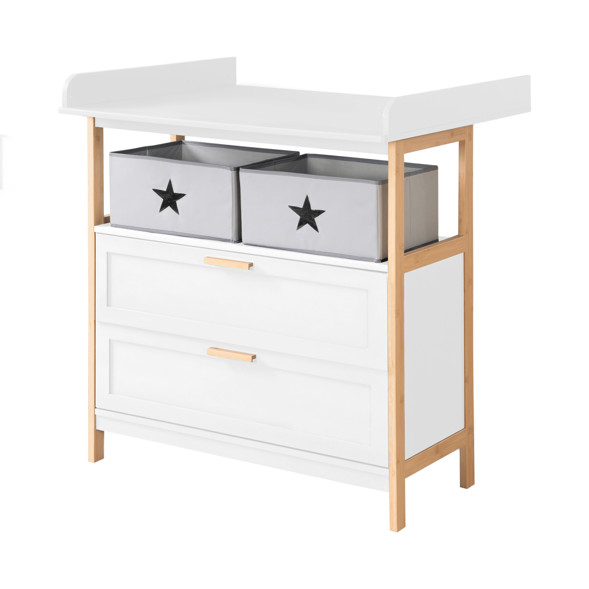 Das zeitgemäße Design in weißer Optik mit kontrastreichen Holzgriffen und Bambusfüßen verleiht der Kommode eine moderne Note. Sie bietet nicht nur eine stilvolle Ästhetik, sondern auch eine durchdachte Aufteilung mit zwei Schubladen, zwei hübschen Stoffboxen und einem offenen Fach.