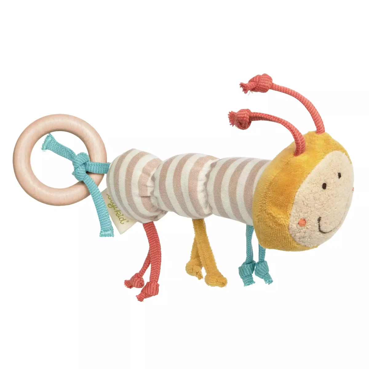 Mit diesem super süßen Greifling Raupe von sigikid wird dein kleiner Schatz optimal bei ersten Greif- und Festhalteversuchen unterstützt. Im Inneren der Raupe mit den niedlichen Kordelbeinchen befindet sich eine Rassel, die zudem das Interesse deines Kindes weckt. Die verschiedenen Stoffe des Greiflings bestehen aus 100% Bio-Baumwolle und gefüllt ist er mit 100% Schurwolle, sodass du ihm deinem kleinen Schatz bedenkenlos zum Schmusen in die kleinen Fingerchen geben kannst. Der abnehmbare Spiel- und Beißring besteht aus glattem Buchenholz.