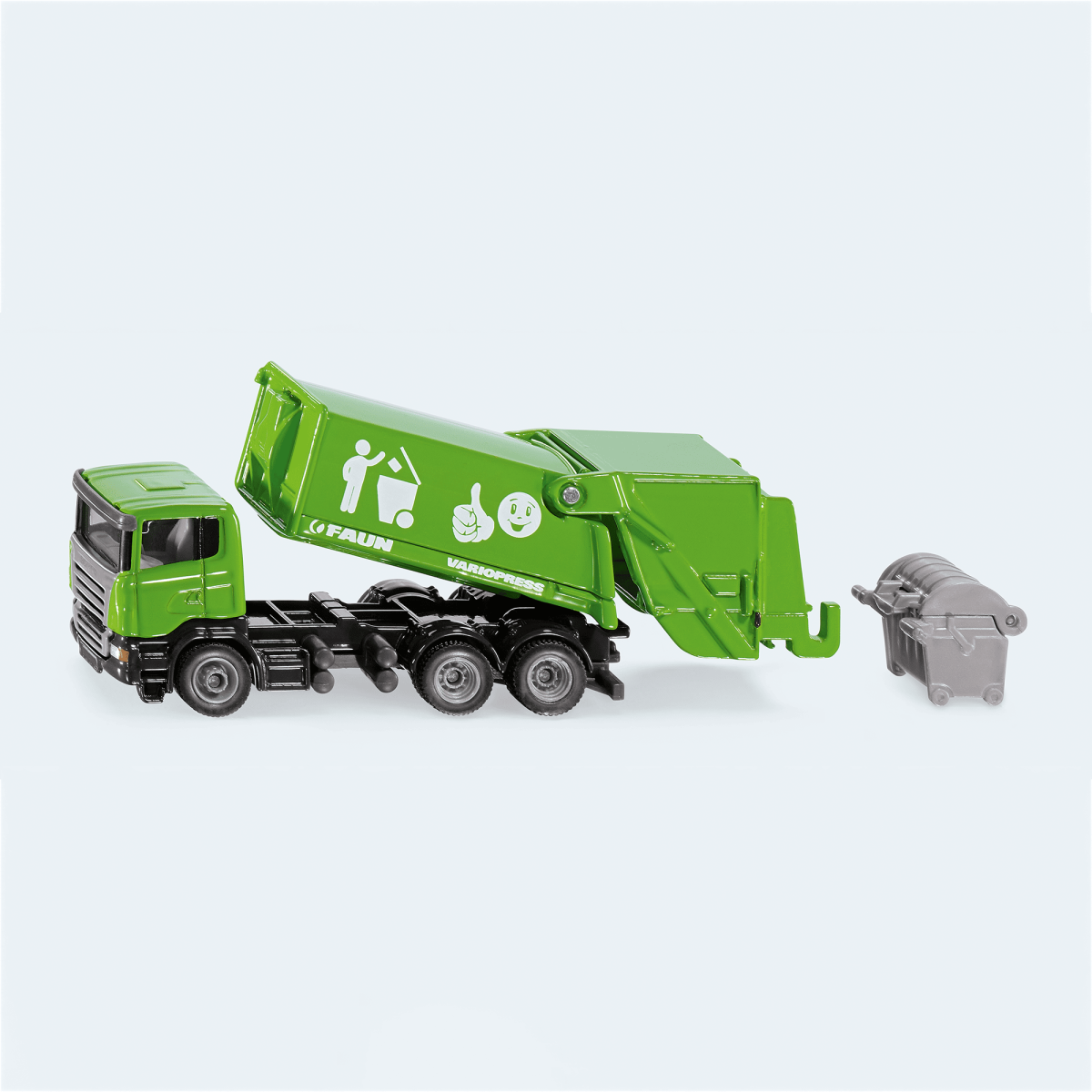 Entsorgungsfahrzeug der Marke Faun auf Basis eines Scania R-Fahrerhauses. 3-Achs-Fahrgestell mit einem Müllbehälter-Aufbau neuester Designentwicklung. Eine coole Bedruckung und die zu öffnende Ladevorrichtung am Heck runden das Bild dieses ansprechenden Modells im Maßstab 1:87 ab. Ein Großraummüllbehälter ist als Zubehör dem Modell beigefügt.