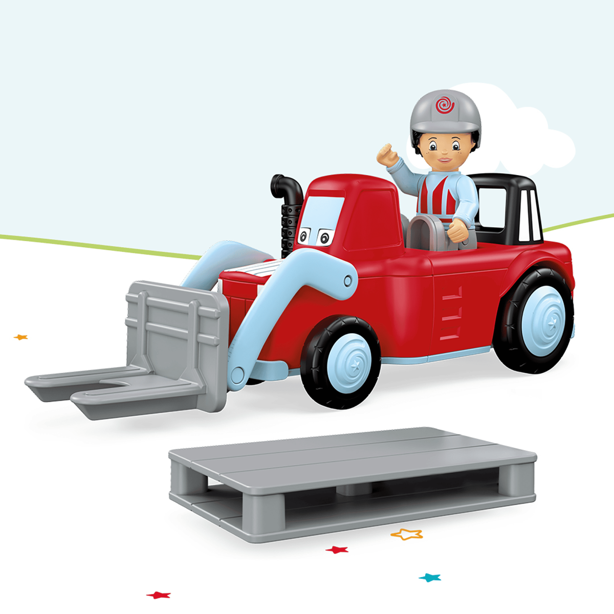Die Arbeit ruft! Der begabte Handwerker Willy erledigt alle anfallenden Arbeiten auf seinem Hof mit Freude und viel Energie. Nachdem das alte Tor seiner Scheune kaputt war, hat er kurzer Hand ein schönes neues gezimmert. Nun erstrahlt das Tor in neuem Glanz. Dank des besseren Schutzes vor Regen und Wind kann Stroh und Holz für den Winter wieder eingelagert werden. Aber Willy kann nicht alle Arbeiten auf dem Hof alleine erledigen, deshalb hat er seinen treuen Freund Worky, den Hoflader, der ihn unterstützt, wo er kann. Willy stapelt fleißig Holz, Kisten und Steine auf Paletten. Worky transportiert sie dahin, wo Willy sie benötigt. Mit Willys tollen Ideen und Workys starken „Staplerarmen“ sind die beiden ein eingeschworenes Team. Spannendes, hochwertiges Spielzeug für Kinder ab ca. 24 Monaten mit Friktionsmotor zur Förderung der Feinmotorik, Ausdauer, Geduld und zum Spaß haben. Die Spielfigur Willy ist beweglich: Der Kopf lässt sich drehen, die Arme lassen sich heben und die Beine können angewinkelt werden. Das Fahrzeug Worky lässt sich in zwei Teile zerlegen und mit weiteren Toddys-Fahrzeugen kombinieren. Die verstellbare Staplergabel und die Palette fördert zusätzlich das Spielerlebnis. Willy Worky ist kompatibel mit Bausteinen anderer Hersteller. Das siku-„Click&Play“-System sorgt für einfaches Kombinieren durch Dreh-Steck-System der Fahrzeugteile zur Förderung der motorischen Fähigkeiten und für langanhaltenden Spielspaß. Natürlich ist das Spielzeug in gewohnter siku-Qualität robust verarbeitet.