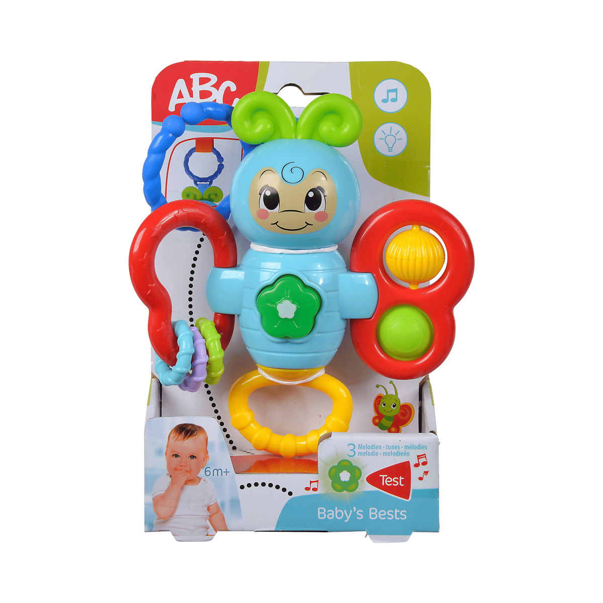 Das Highlight des „ABC Multifunktionsfalters“ ist jedoch der Knopf am Bauch: Mit Licht und Sound fasziniert er dein Baby und sorgt so für gute Laune. Dank des praktischen Clips am Kopf lässt sich der Schmetterling zudem ganz einfach an Kinderwagen und Babyschale befestigen.