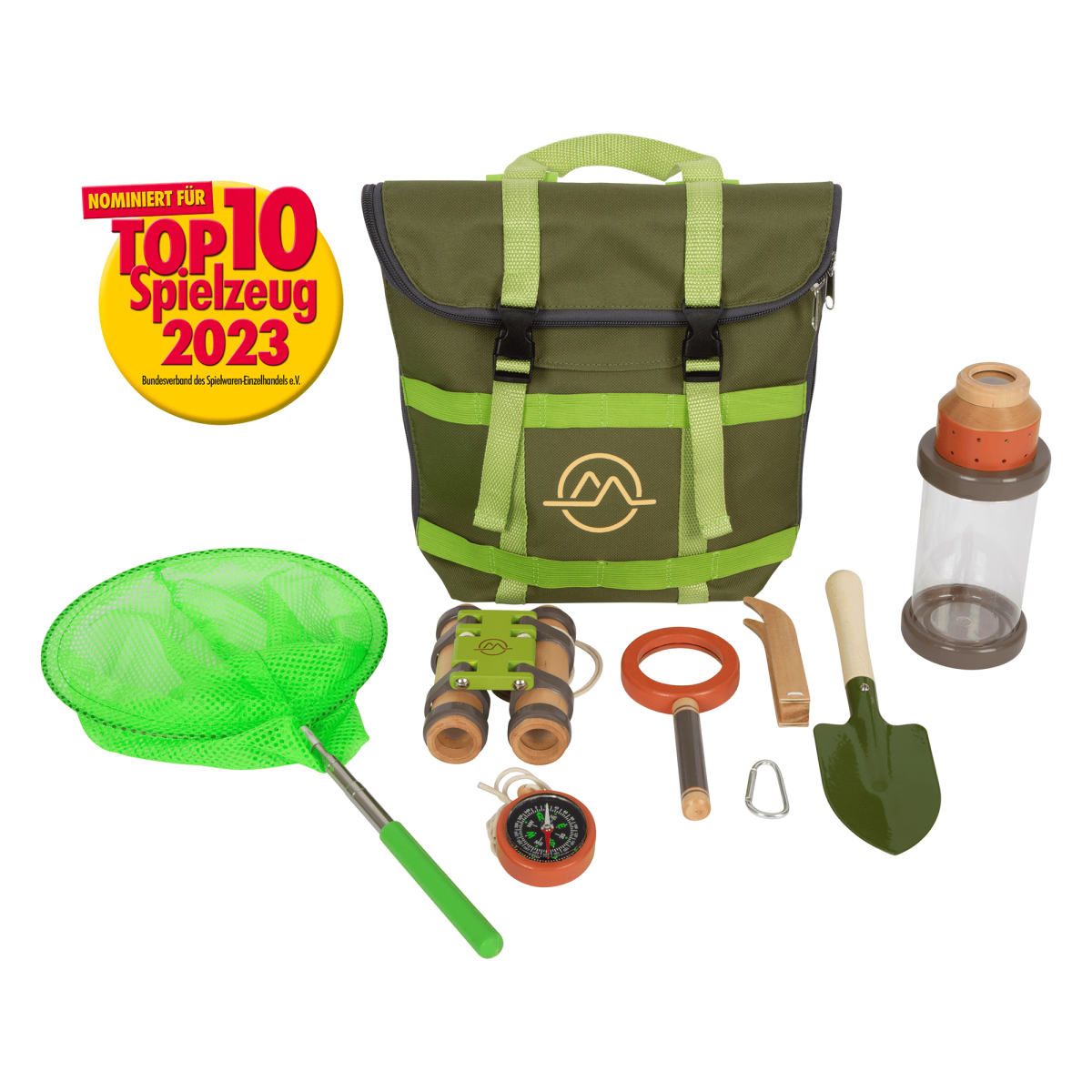 Ausgestattet mit einem kompletten Forscher-Equipment bietet der Rucksack eine extragroße Becherlupe, in der nicht nur Blätter und Äste, sondern auch faszinierende kleine Bewohner Platz finden. Der verschraubbare Becher, das Holzfernglas, das Schmetterlingsnetz mit Teleskoparm, der Kompass mit Trageband, die Lupe mit Vergrößerungsfunktion sowie Pinzette, Schaufel und Karabiner lassen keine Entdeckerwünsche offen.