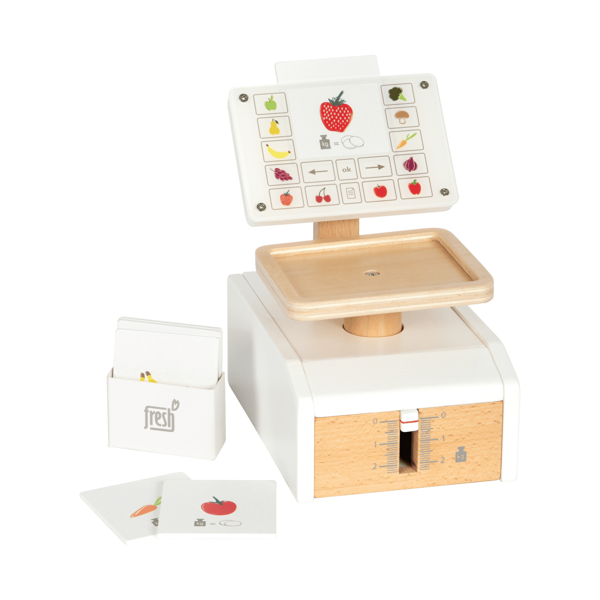 Die Waage fresh von small foot macht das Einkaufen und Verkaufen im Kinderzimmer-Supermarkt zum echten Erlebnis! Mit ihrer realistischen Optik und den detailreichen Obst- und Gemüsekarten lernen kleine Kaufleute spielerisch den Umgang mit Mengen und Gewicht.