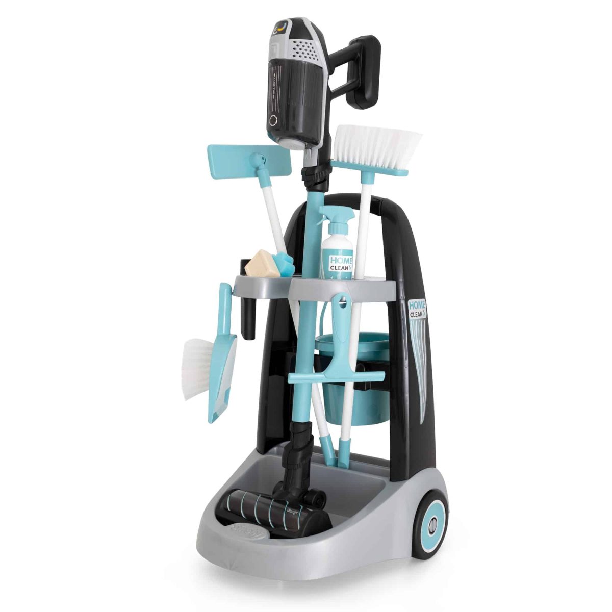 Mit dem Smoby Reinigungstrolley und dem originalgetreuen Rowenta Kinderstaubsauger wird dein Kind zum kleinen Putzprofi! Dein kleiner Schatz kann nun spielerisch Mama und Papa beim Saubermachen unterstützen. Der Reinigungswagen ist kinderleicht zu bewegen, perfekt dimensioniert und enthält alles, was dein Kind für die Haushaltsarbeit benötigt: einen Kinderbesen, ein Kehrset, einen Wischmopp, einen Fensterabzieher, einen Schwamm, Spielzeug-Putzmittel und das absolute Highlight des Trolleys – einen originalgetreuen Rowenta Kinderstaubsauger!