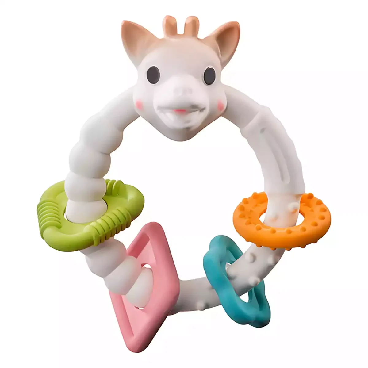 Dieser Beißring ist aus 100% natürlichem Kautschuk und mit Lebensmittelfarbe bemalt. Er ist mit zahlreichen weichen Abschnitten zum Kauen und verschiedenen Texturen versehen und bietet verschiedene Stimulationsmöglichkeiten. Zudem trägt er zur wirksamen Linderung für das Zahnfleisch deines kleinen Schatzes bei. Die vier geometrischen Formen in lebendigen Farben ziehen die Blicke auf sich und dein Baby kann sie um den Hauptring schieben. Leicht und ergonomisch ist der Ring mühelos für kleine Hände zu greifen und zu halten.